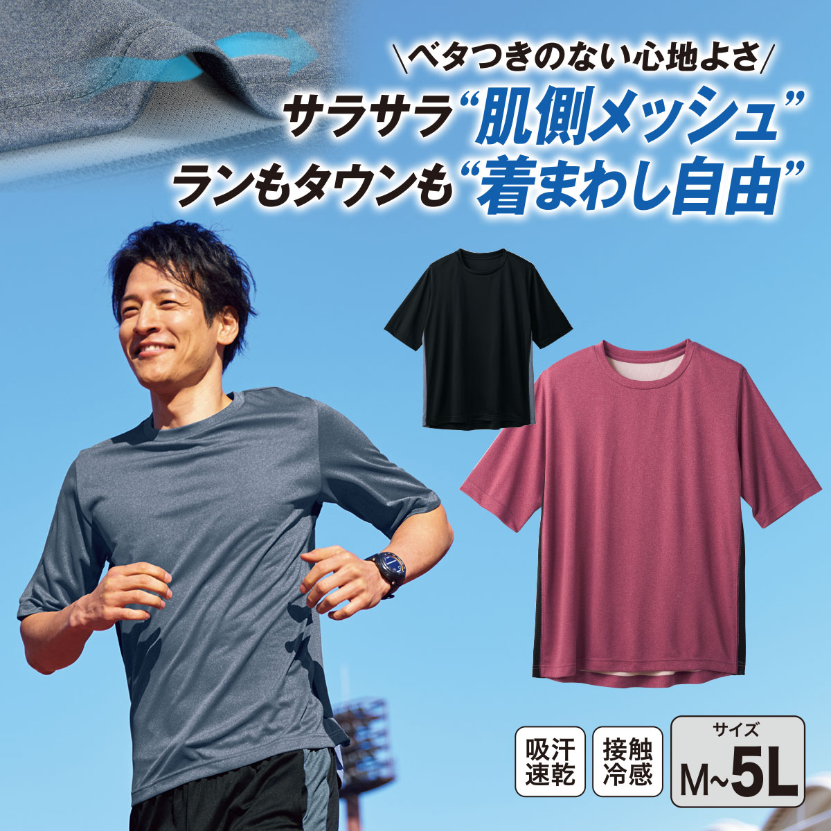 接触冷感機能でひんやり!表見えは杢調、肌側はメッシュ。
