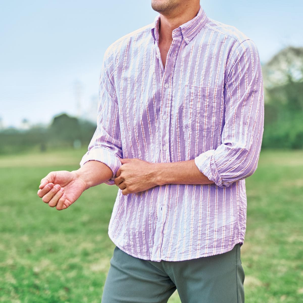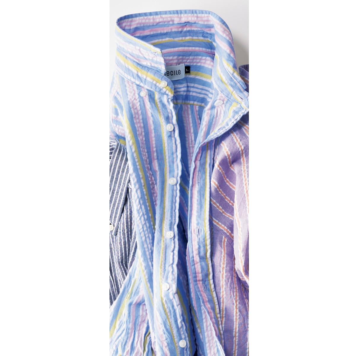 ぽこぽこした凹凸のある綿100%サッカー素材がサラリと涼しく爽やかな夏のシャツ。