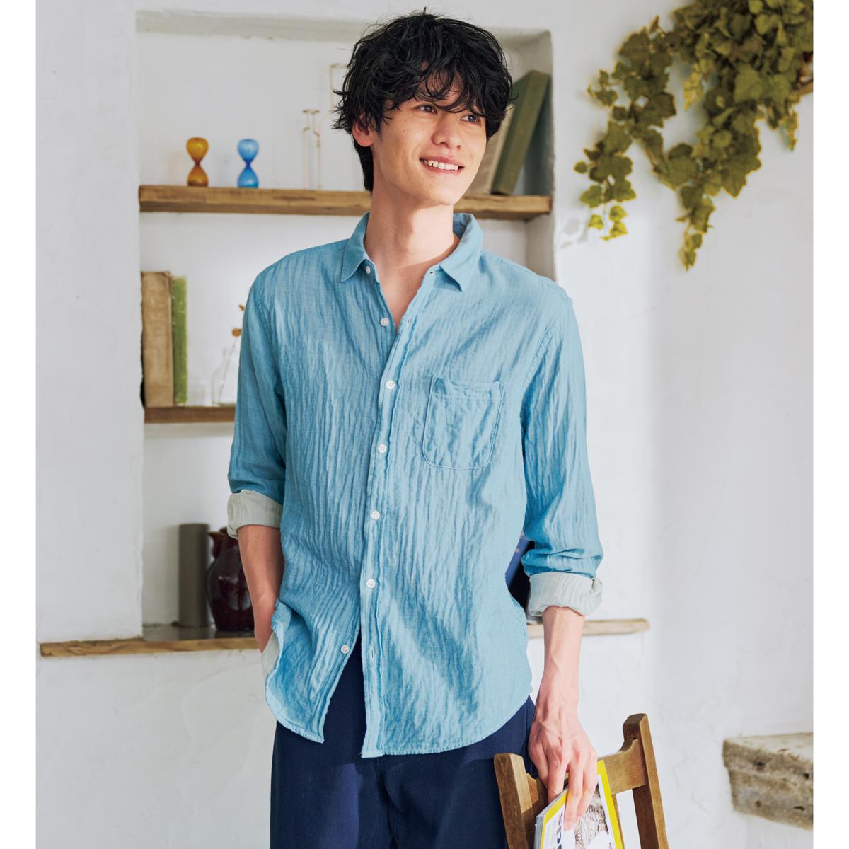 ニュアンスのある表情と涼しさがうれしいガーゼの二重織りシャツ。サラリと風を通すクールな感触を楽しみたい。