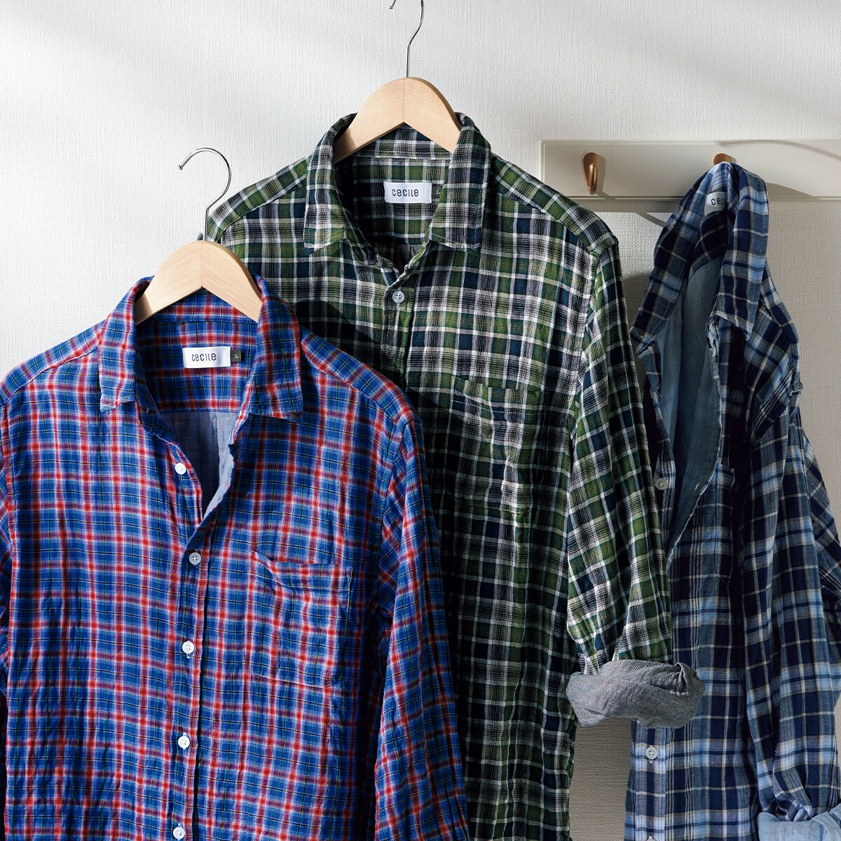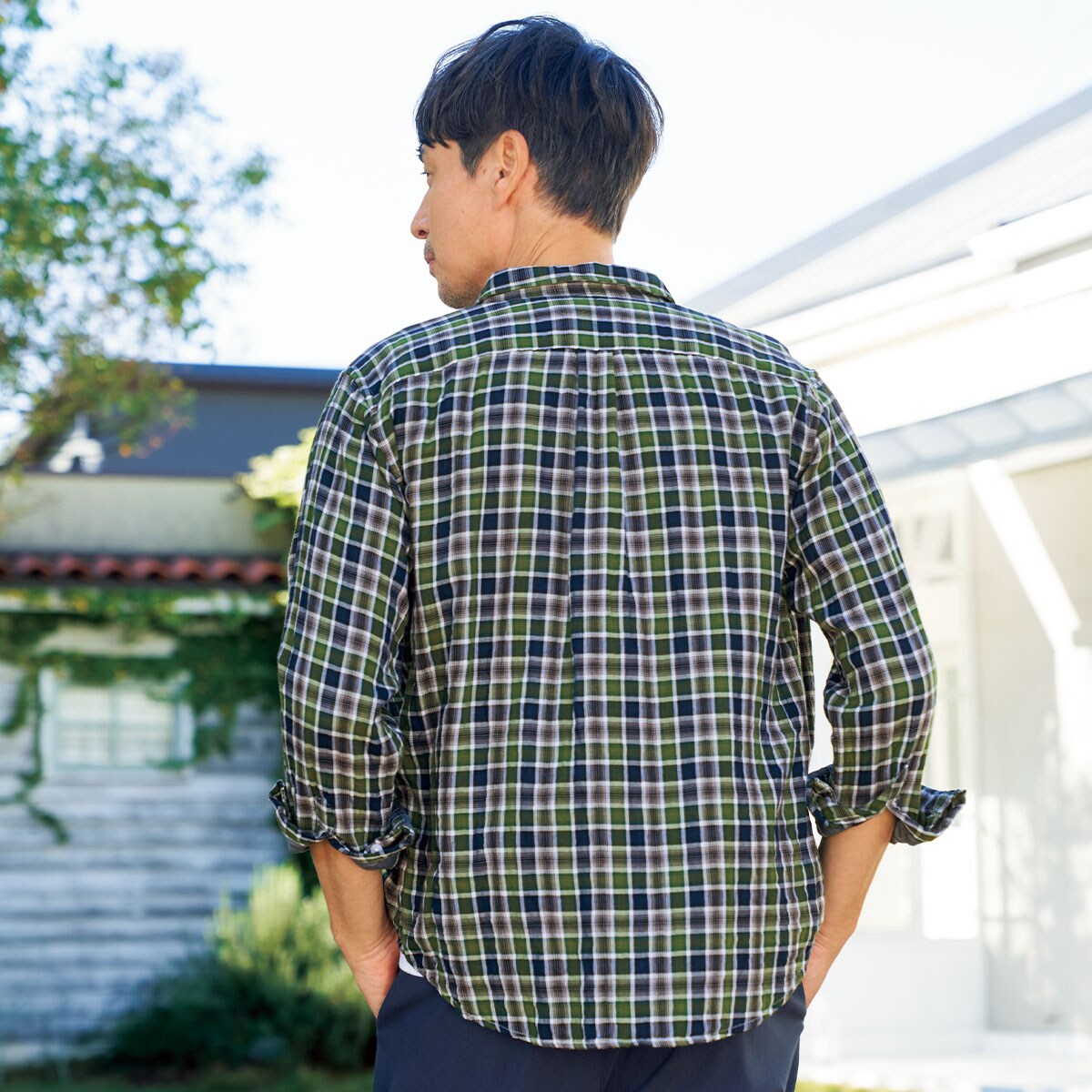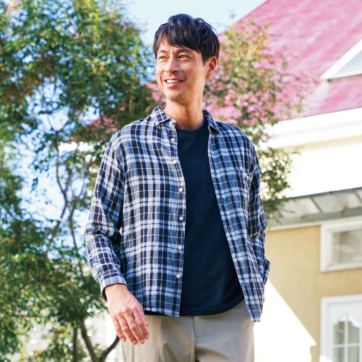 定番のチェック柄で、さりげなく若見えする着こなしに!前ボタンを開け気味に着ると思い切りオフモードに。