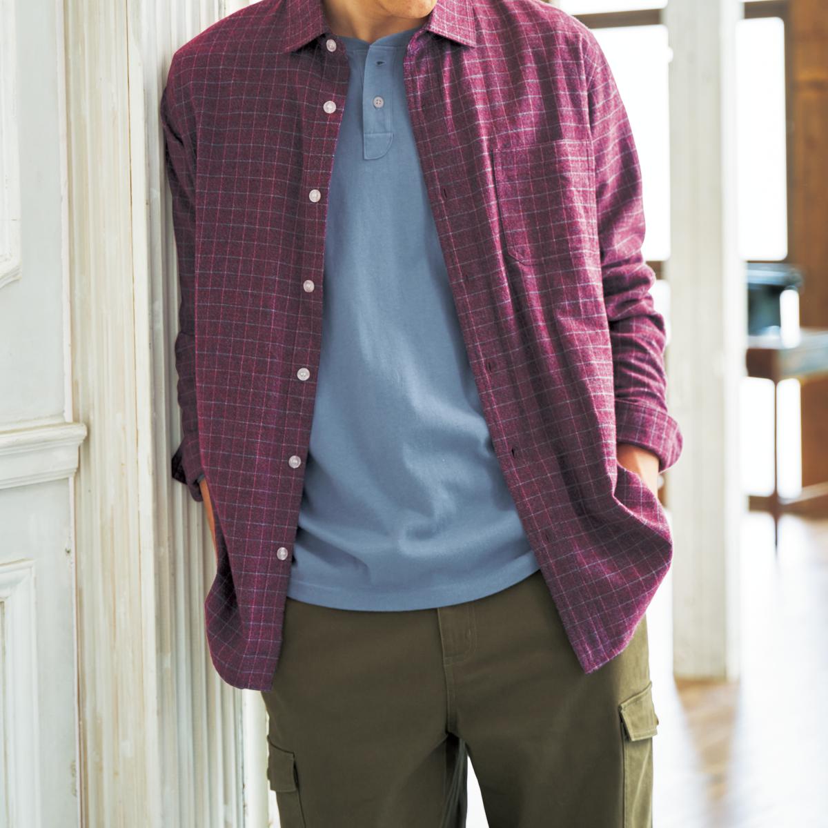 -お買い得ポイント-奥行きのある杢調の格子チェックはTシャツとの色合わせも楽しい。-デザイン-深みのあるチェック柄で風合いの良さが魅力です。左胸にポケットが付いています。-素材特徴-ミックス糸で風合いのよい微起毛シャツです。光吸収発熱機能でぬくもりを保ちます。綿混で肌ざわり柔らか。