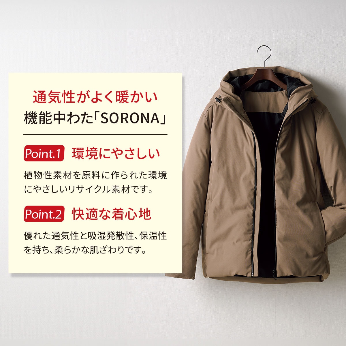 中わたに使用されているSoronaR (ソロナ)は、蒸れにくく、優れた保温性、フワフワ感を持っています。
