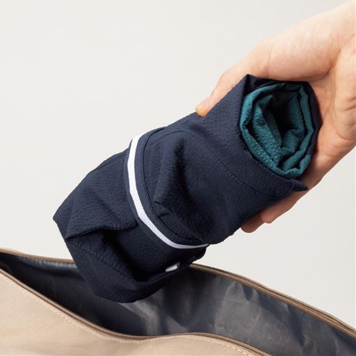 -お買い得ポイント-ドライな肌ざわり&ストレッチ素材で動きやすいです。畳んで衿裏のゴムで留められ、コンパクトに持ち運びできます。-デザイン-裾スピンドルで好みのシルエットにして着こなせます。スリットポケットなので、目だたずスッキリした印象です。-素材特徴-サラッとした質感で、凹凸のあるサッカー素材。