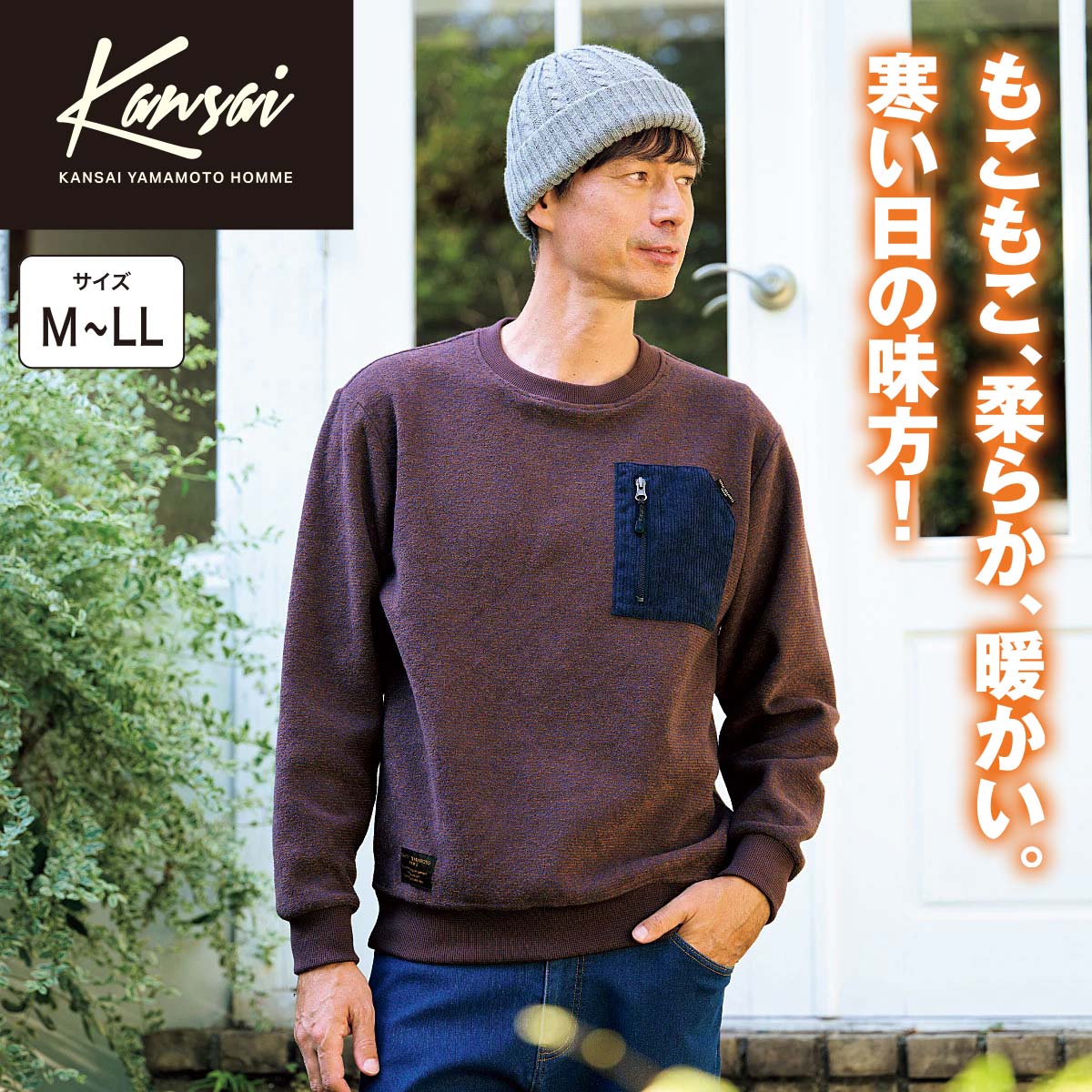 -お買い得ポイント-デザインも魅力の冬仕様トレーナーです。-デザイン-ポケットの配色がおしゃれです。イヤホンなどを収納できるポケット付き。-素材特徴-編地がぽこぽこ浮きだっているブークレー起毛素材。秋冬らしいボリューム感と暖かみをプラスしています。背当てとポケット部分はコーデュロイ素材。