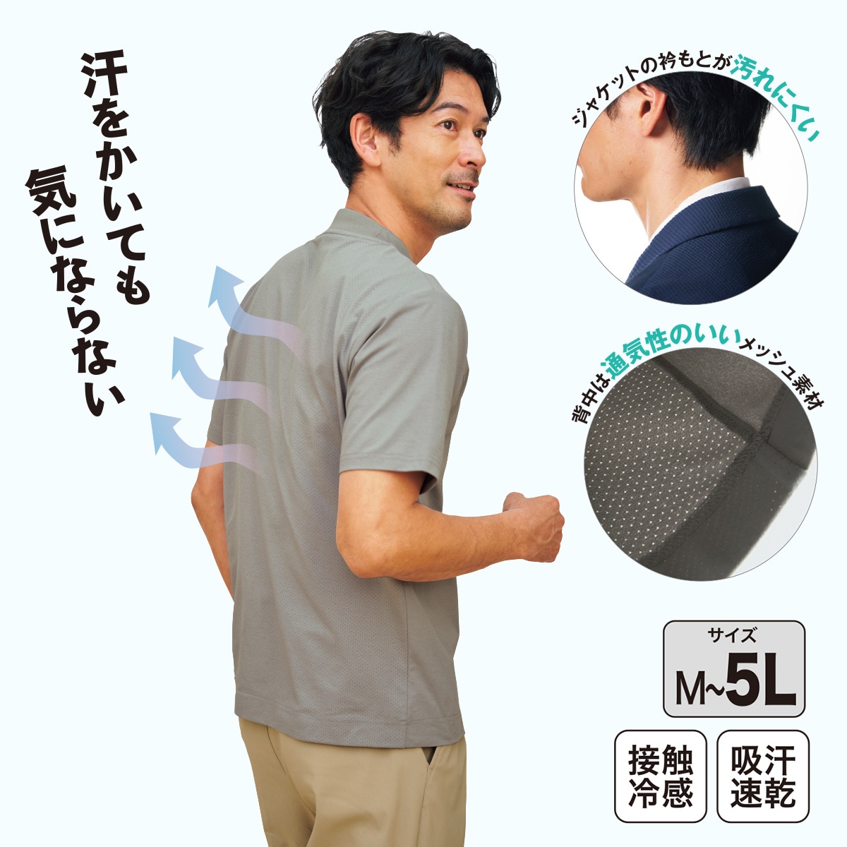 昨年大ヒットのジャケットインTシャツがさらに進化。背中はメッシュ素材になり、ジャケットを着てもムレにくく、接触冷感で着た瞬間にひんやりします。
