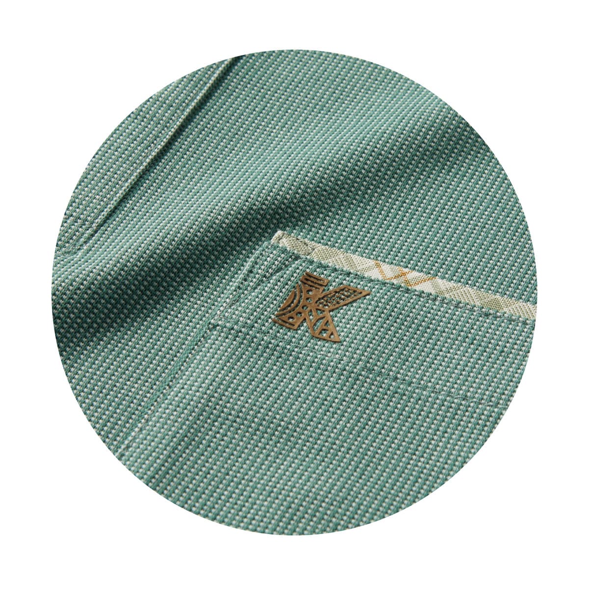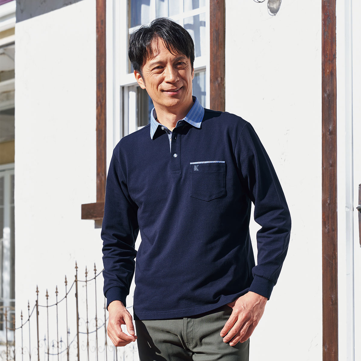「カンサイ」のこだわりが光る布帛のシャツ衿がアクセント。