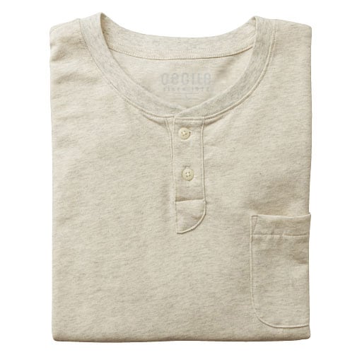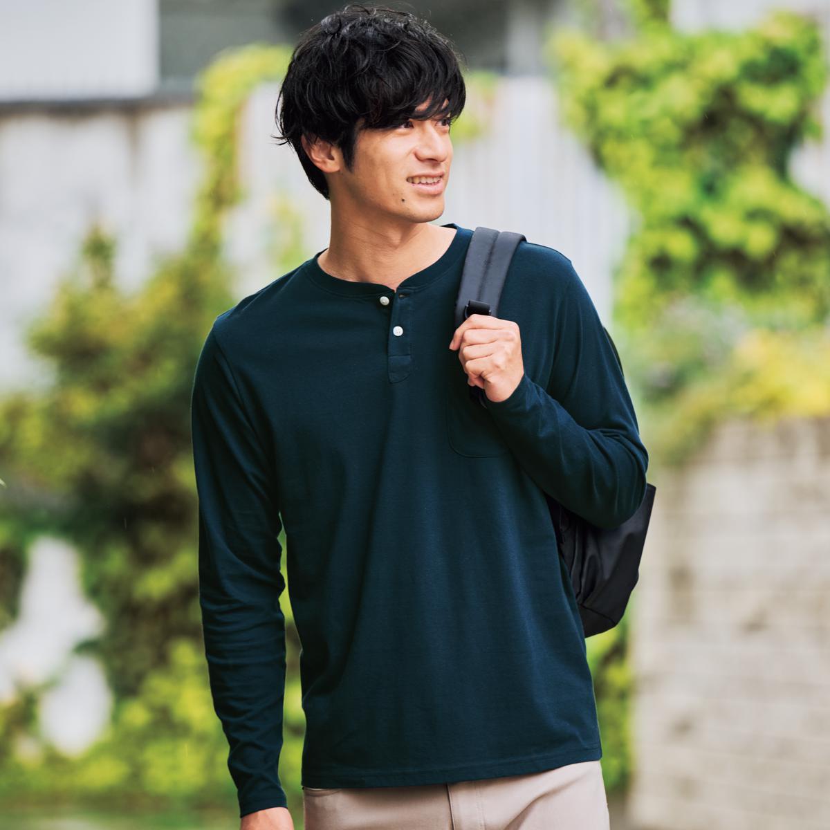 【綿の質感を楽しめる一枚】こだわりメンズのためのベーシックヘンリーネックTシャツ。コットン本来の風合いを引き出しました。