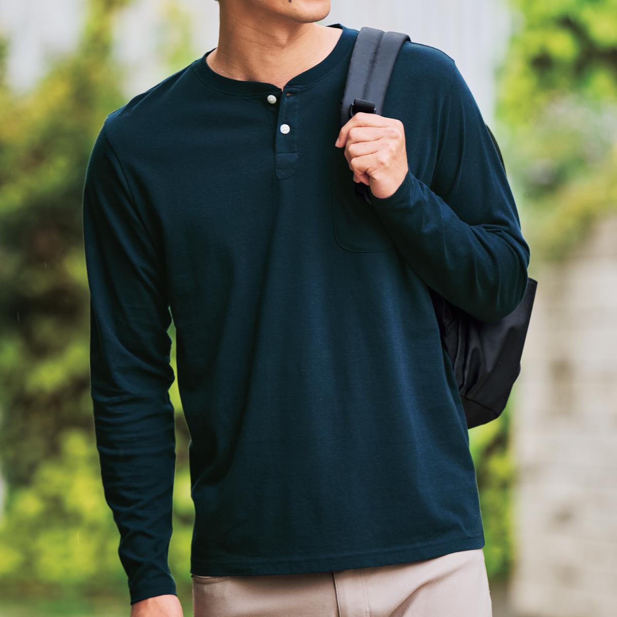 【綿の質感を楽しめる一枚】こだわりメンズのためのベーシックヘンリーネックTシャツ。コットン本来の風合いを引き出しました。