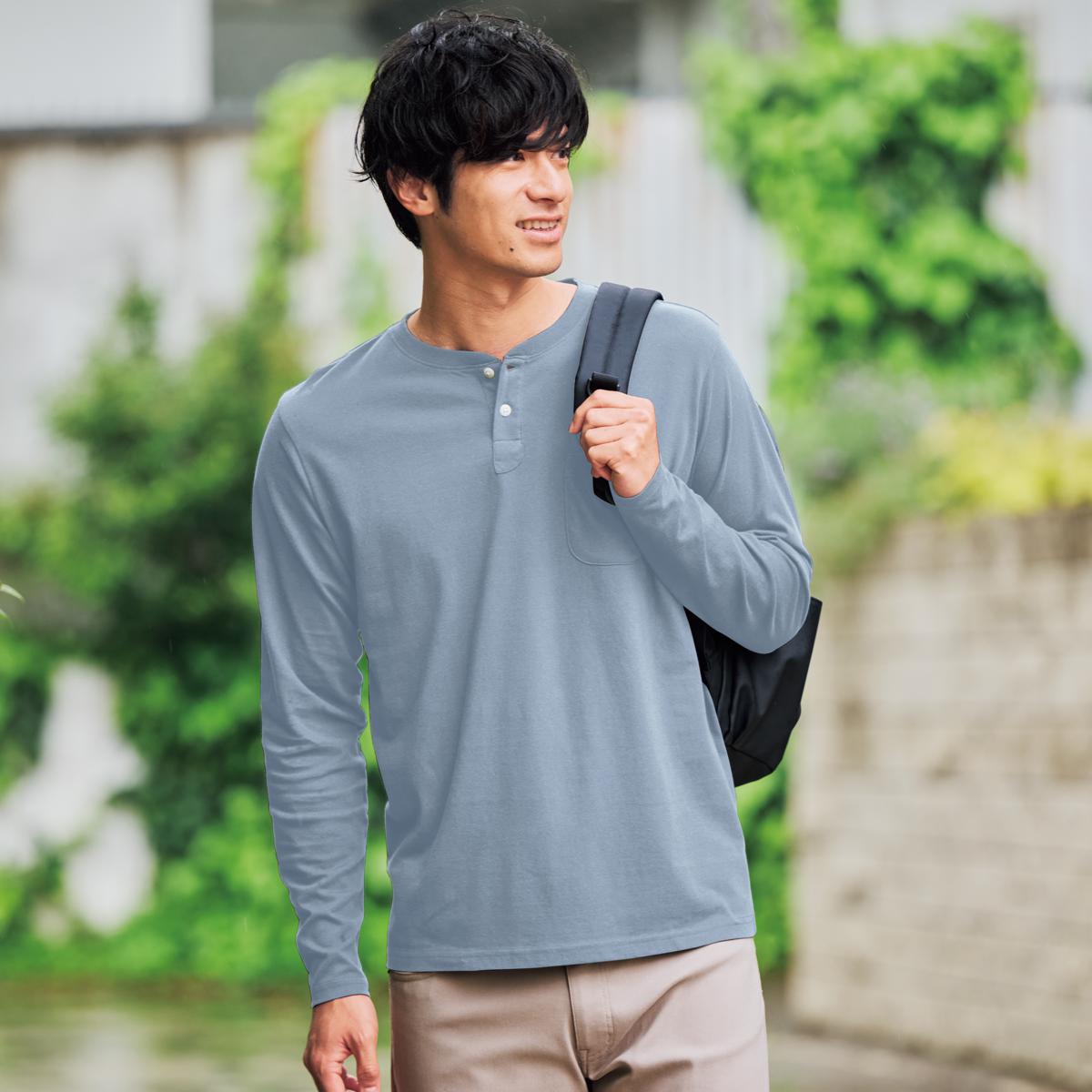 -お買い得ポイント-1枚で着てもサマになり、ベストやジャケットのインナーとしても活躍します。-デザイン-首元のボタンがアクセント。ボタンの開け閉めで、ワイルドな印象から上品な印象まで自在に調整可能。-素材特徴-今まで以上にやわらかさ・ふくらみ感をアップさせた24番単糸・天竺素材が魅力です。