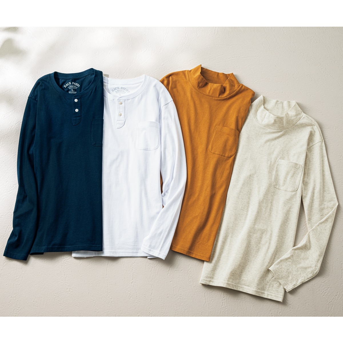 左からダークネイビー、ホワイト、マスタード、オートミールヘンリーネックはJK-593です