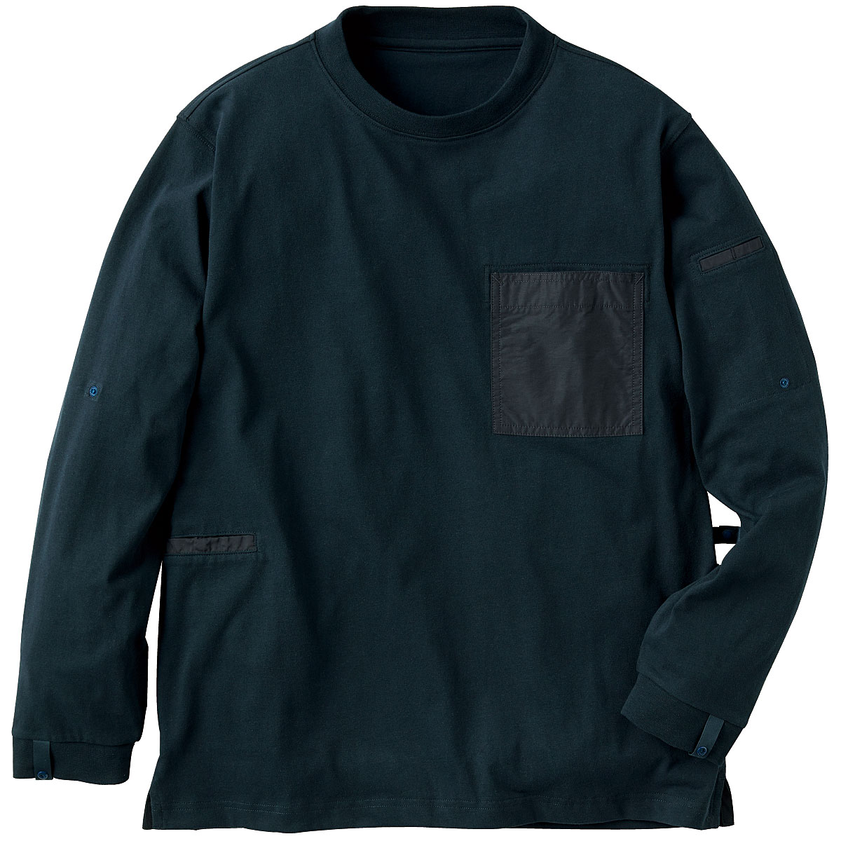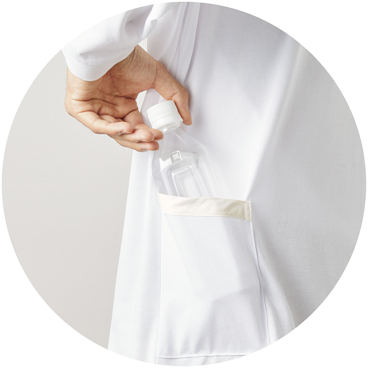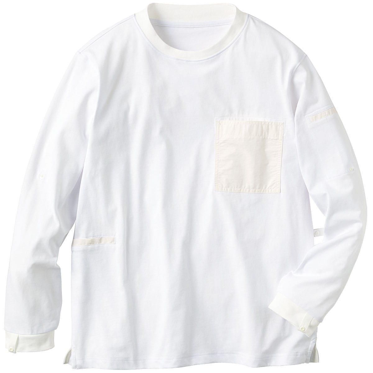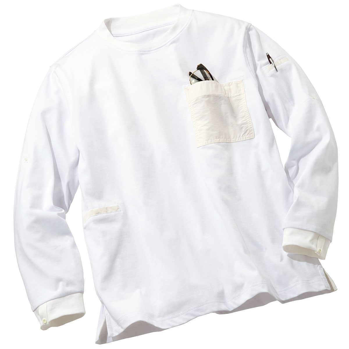 色々なこだわりディテールをつめこんだTシャツです。まずはTシャツなのに多ポケット!胸ポケット、右脇ポケット、袖のペン差しに加え、新たに左脇ポケットにはペットボトルも入るポケットも追加され、収納力にさらに磨きがかかっています。またジャケットに合わせやすいよう、後衿が高めのリブデザインに。ジャケットやアウターを羽織った際に、首の後ろが触れる部分が汚れる…という事ありますよね。大切で洗いづらいアウターを、このTシャツは守ってくれます!