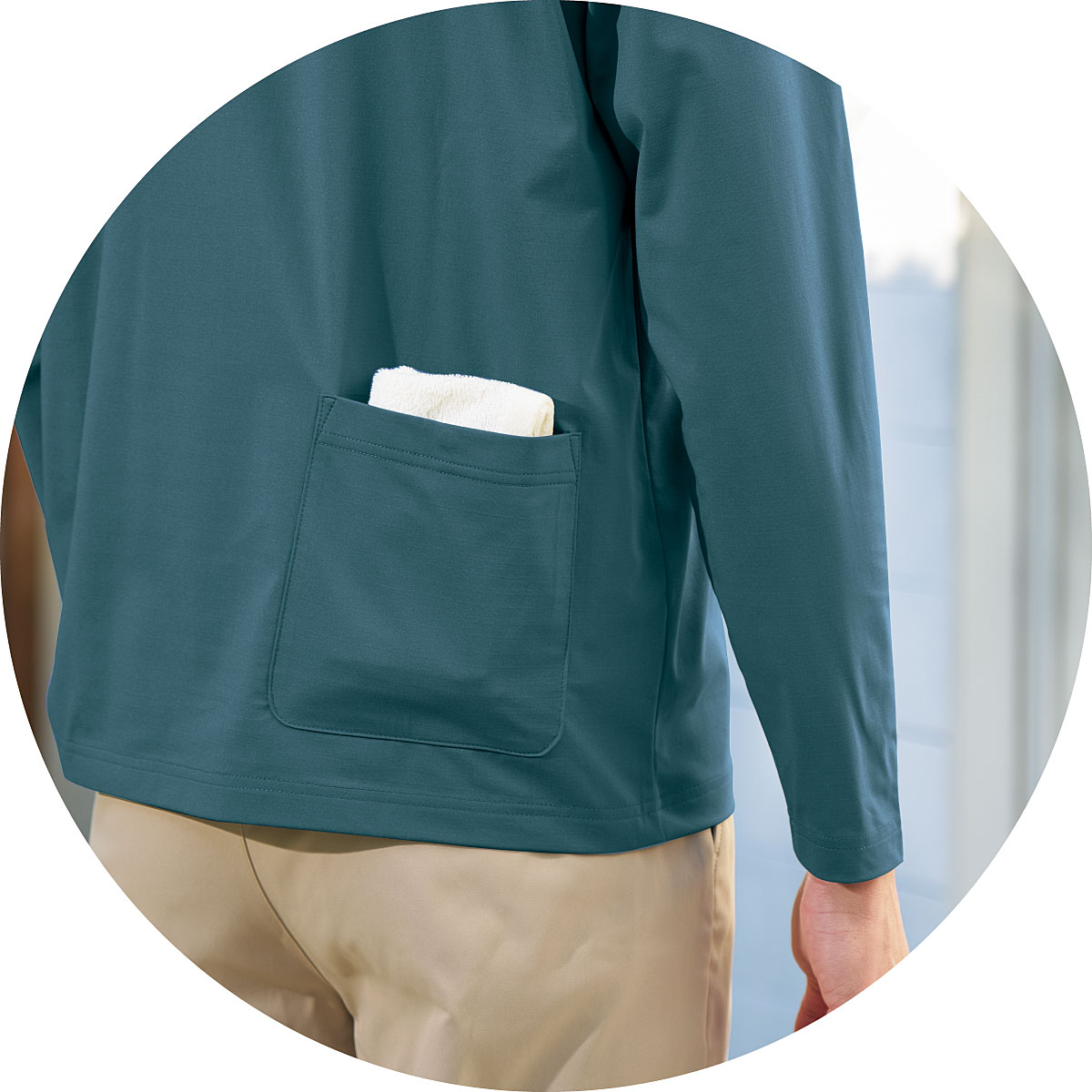 タオルなどがサッと取り出せる背面ポケット※画像は長袖(品番:JK-932)です