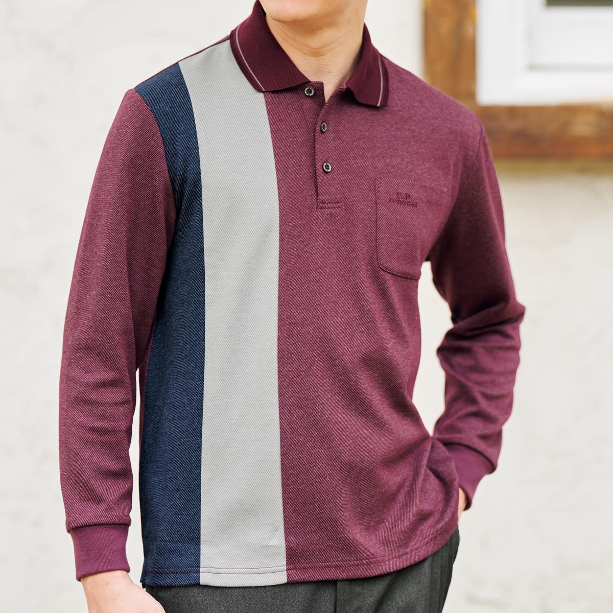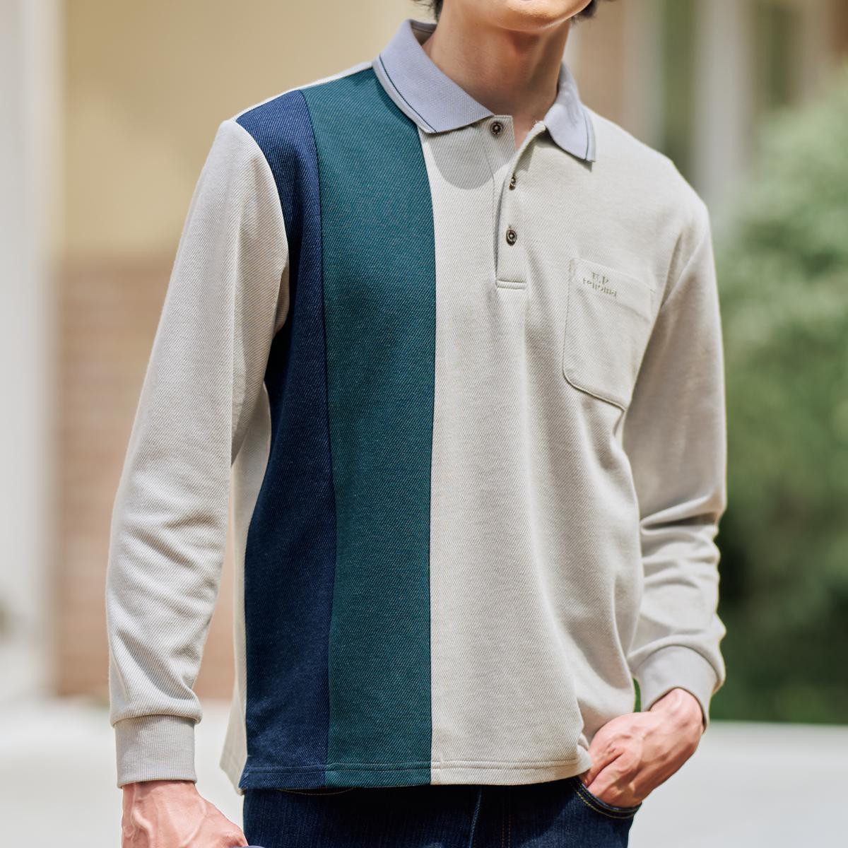 縦ラインの2色パネルで切り替えた存在感のあるデザインのポロ。衿はニット仕様でこなれた印象に。