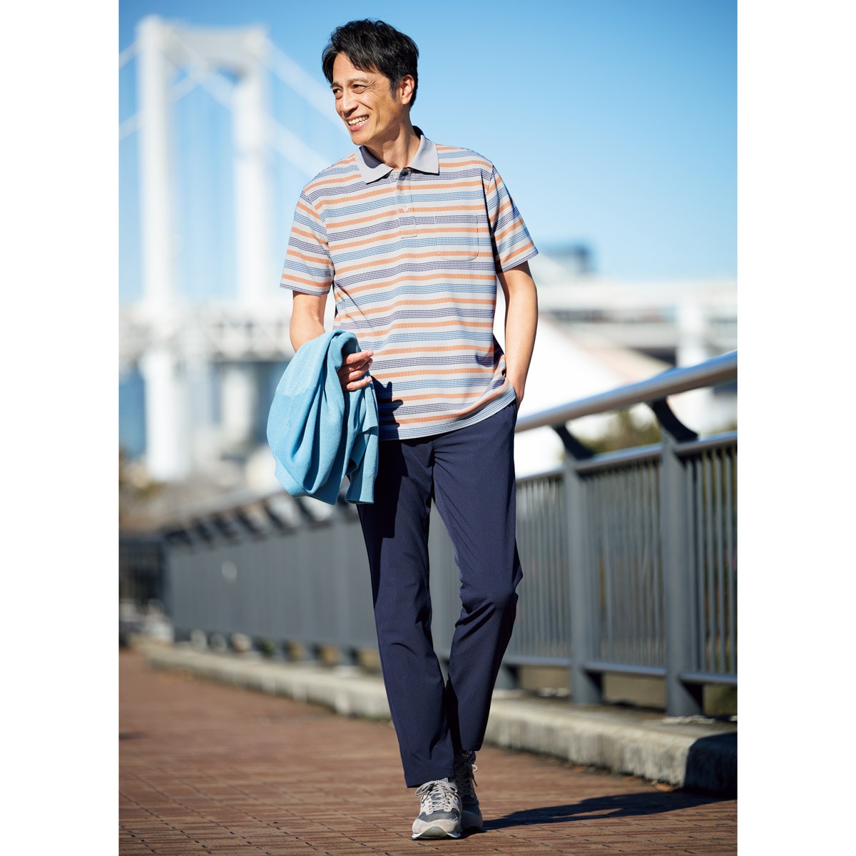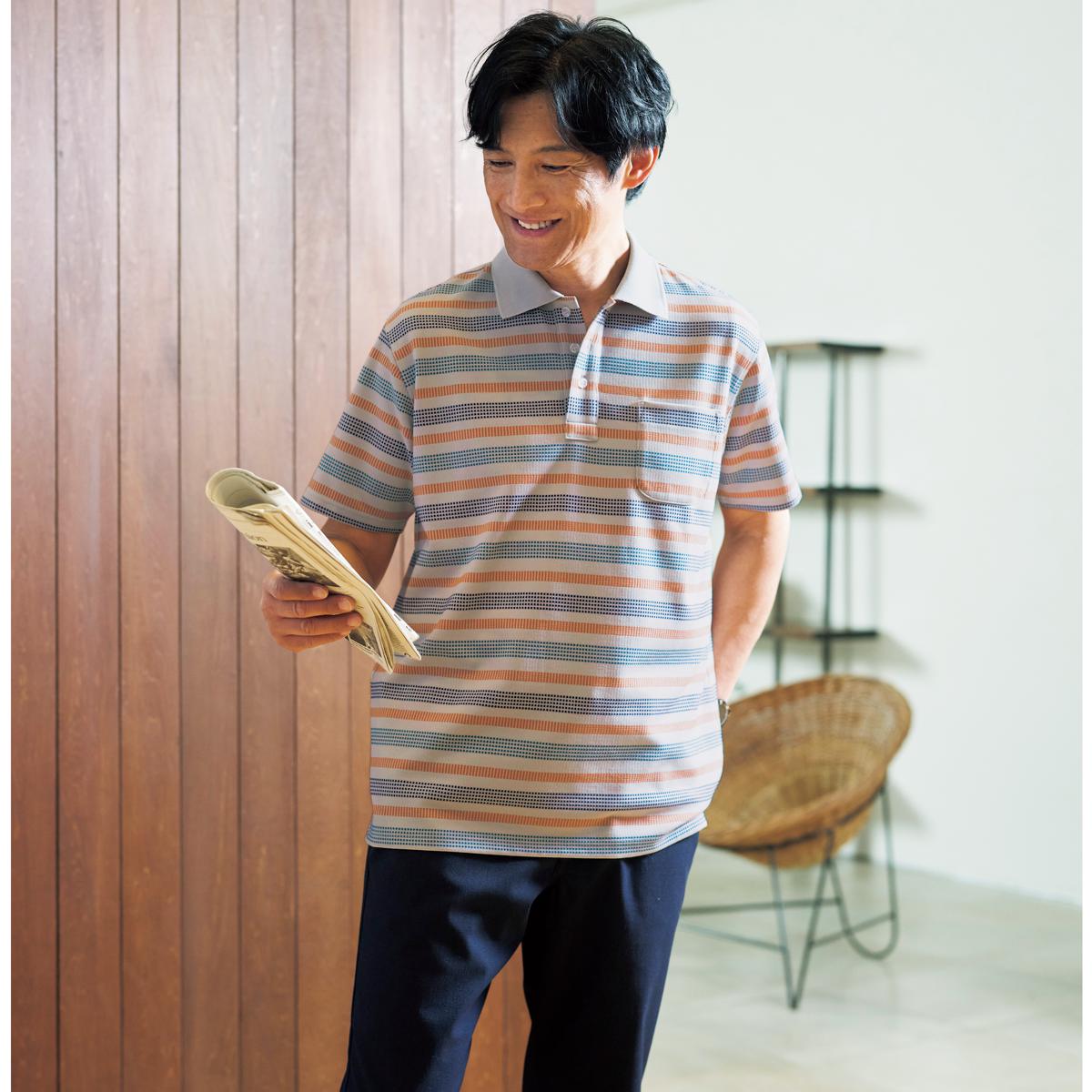 -お買い得ポイント-おうち着にも、外へ出てもおしゃれ&清潔感のあるポロ。-デザイン-半袖ポロにも上品さが際立つジャカード編みの多色ボーダー。夏の1枚着もラフになりすぎない。-素材特徴-肌なじみのよいジャカード素材でくつろぎ時間にも満足感を!