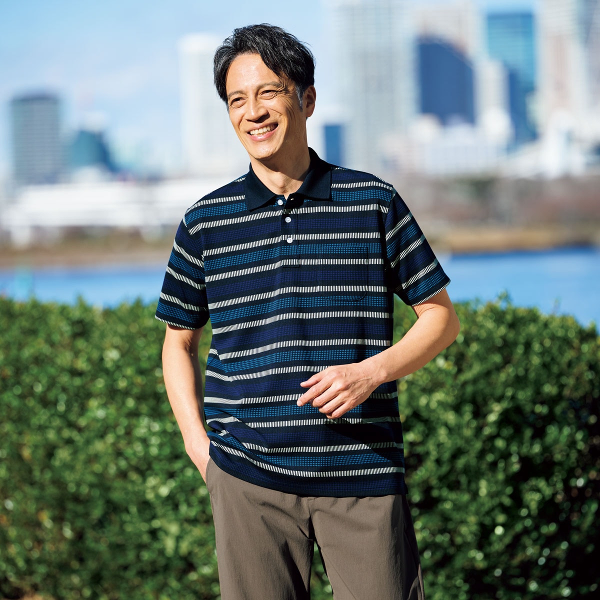 1枚で映える大人の半袖ポロシャツ。半袖ポロにも上品さが際立つジャカード編みの多色ボーダー。