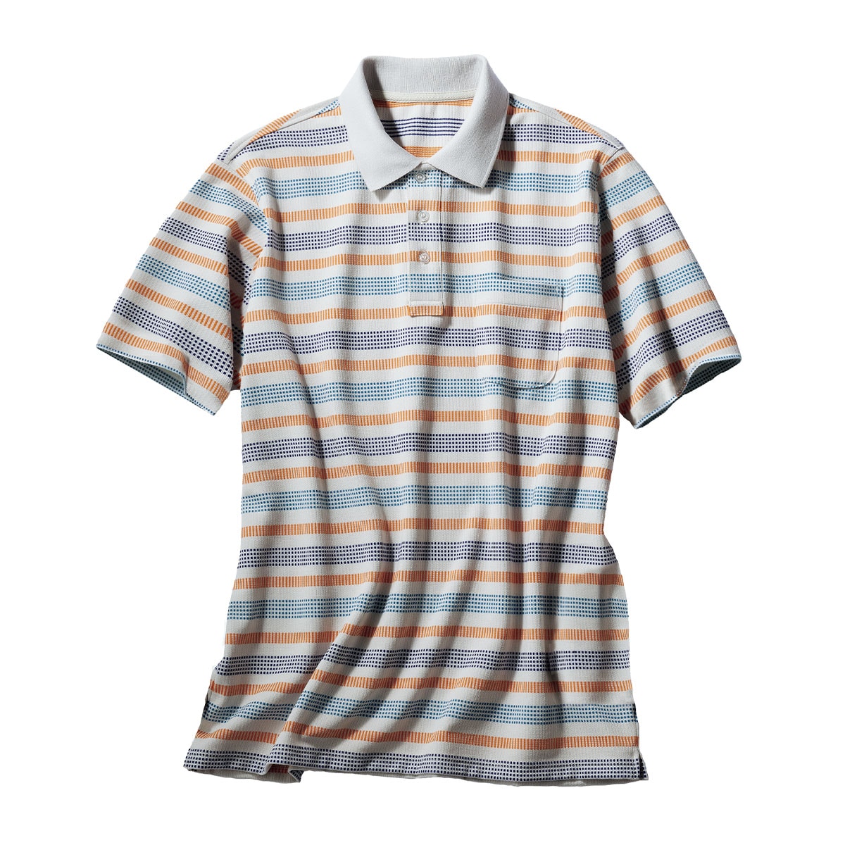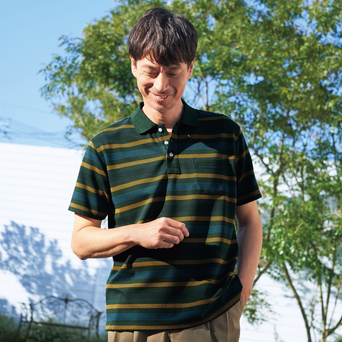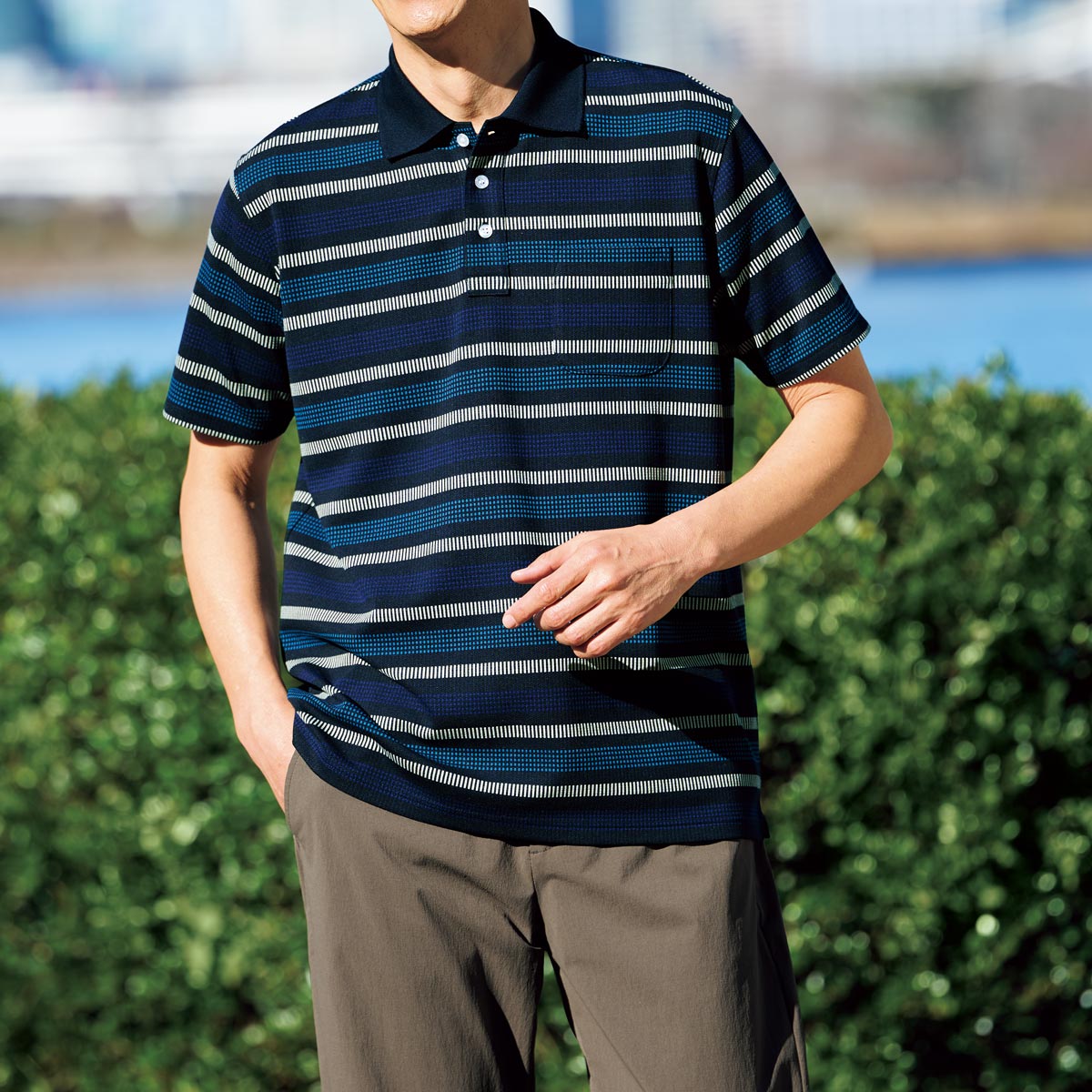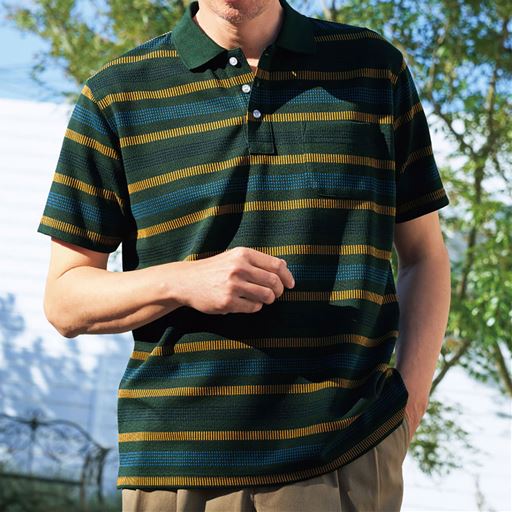 1枚で映える大人の半袖ポロシャツ。半袖ポロにも上品さが際立つジャカード編みの多色ボーダー。