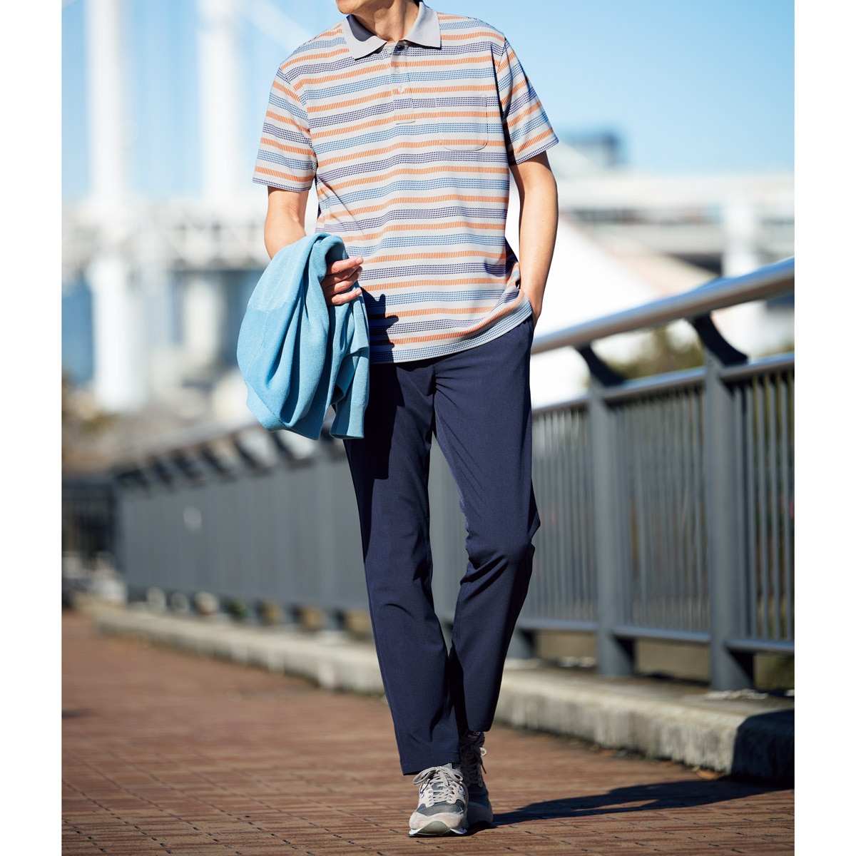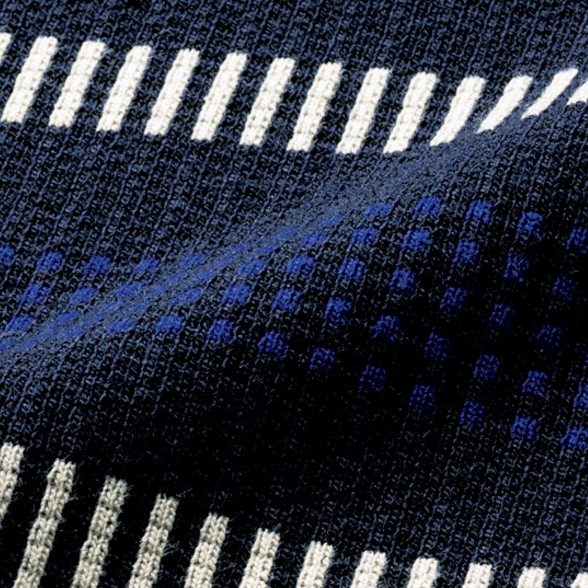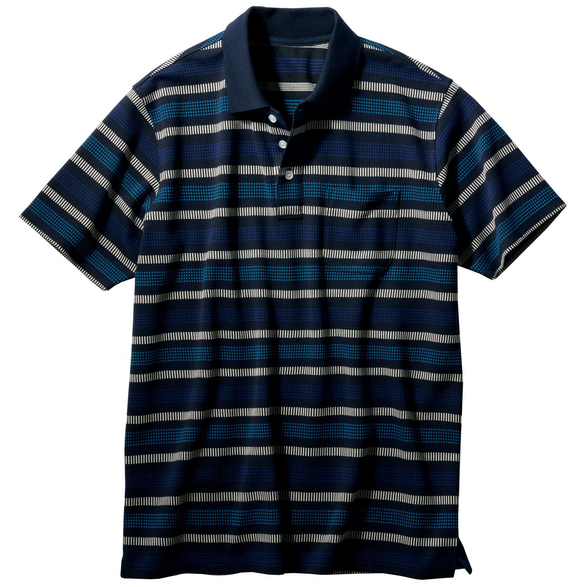 ダークネイビー 半袖ポロにも上品さが際立つジャカード編みの多色ボーダー。夏の1枚着もラフになりすぎない。