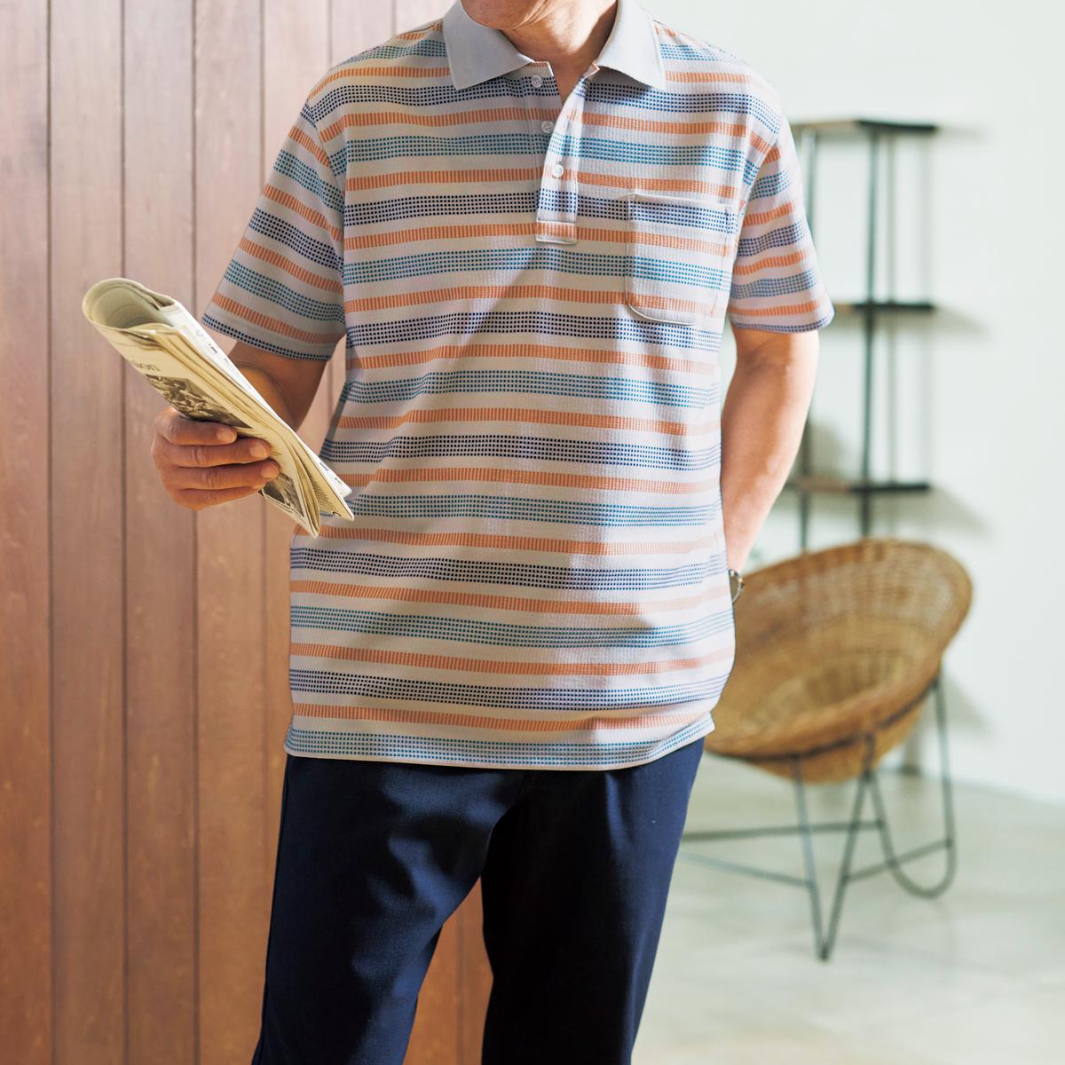 -お買い得ポイント-おうち着にも、外へ出てもおしゃれ&清潔感のあるポロ。-デザイン-半袖ポロにも上品さが際立つジャカード編みの多色ボーダー。夏の1枚着もラフになりすぎない。-素材特徴-肌なじみのよいジャカード素材でくつろぎ時間にも満足感を!