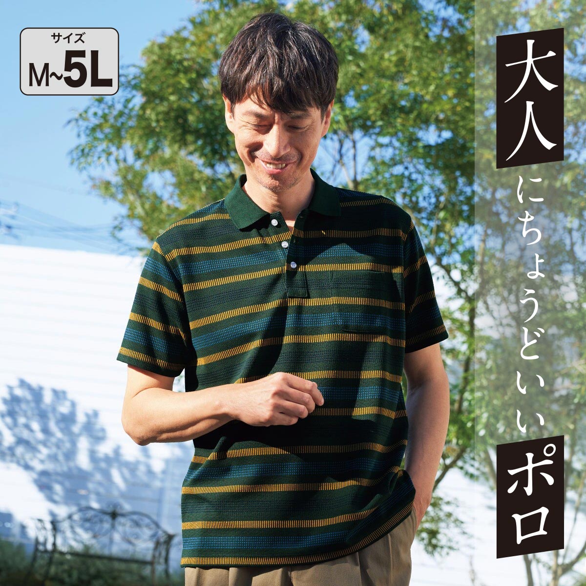 1枚で映える大人の半袖ポロシャツ。半袖ポロにも上品さが際立つジャカード編みの多色ボーダー。