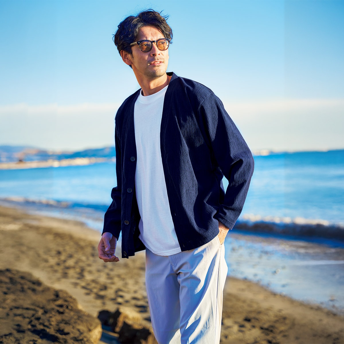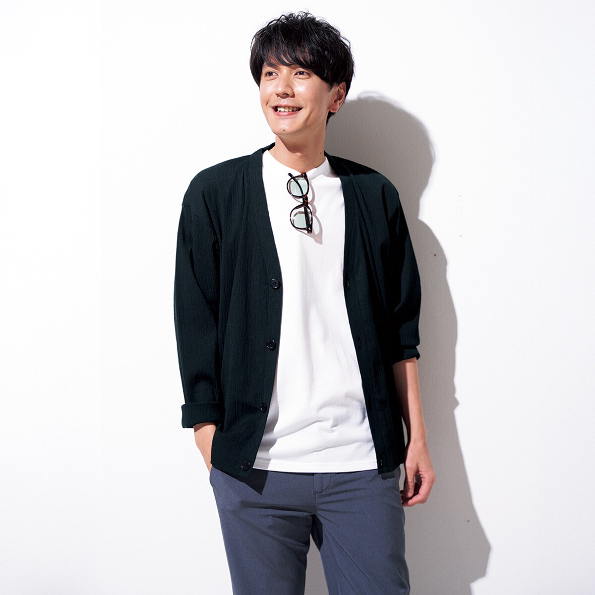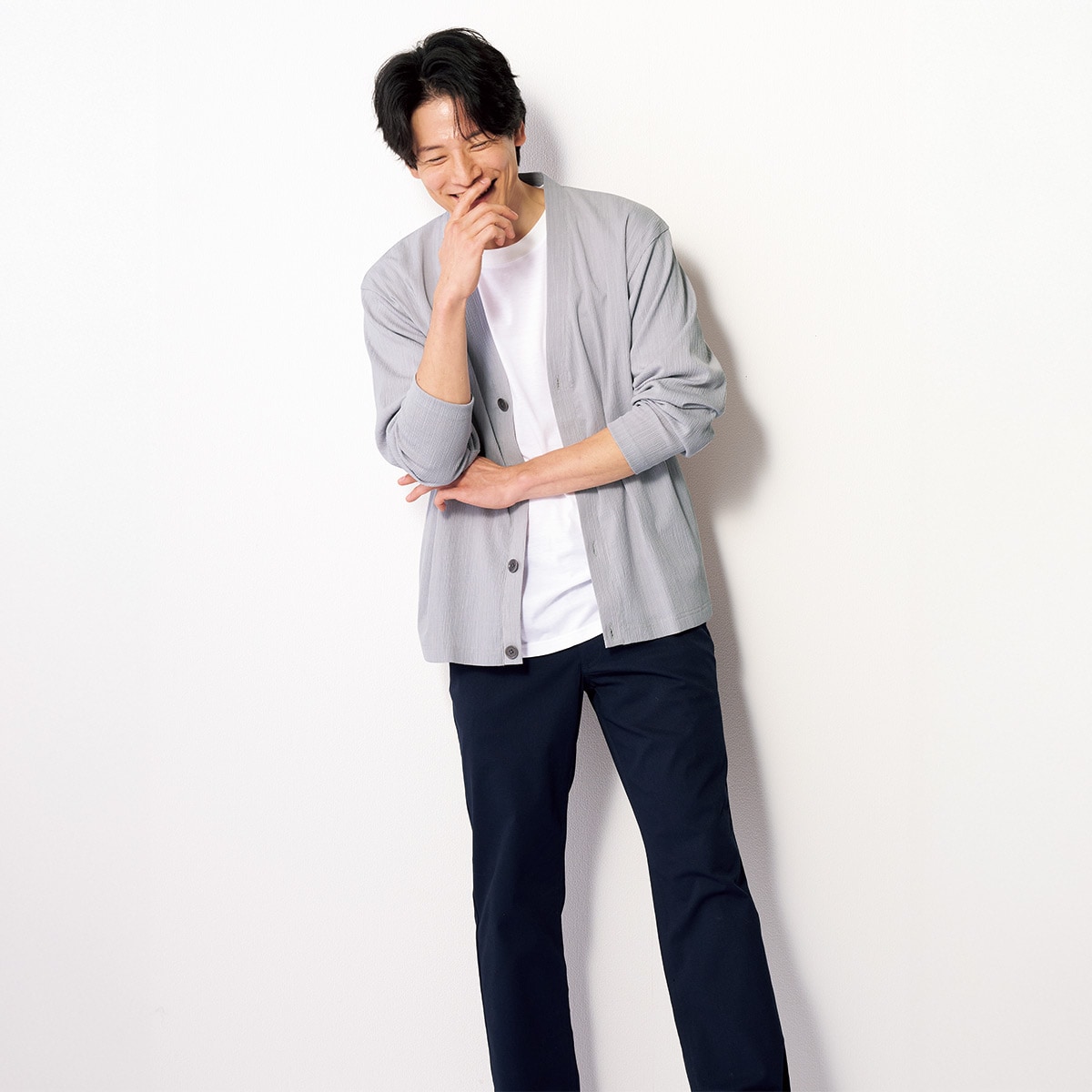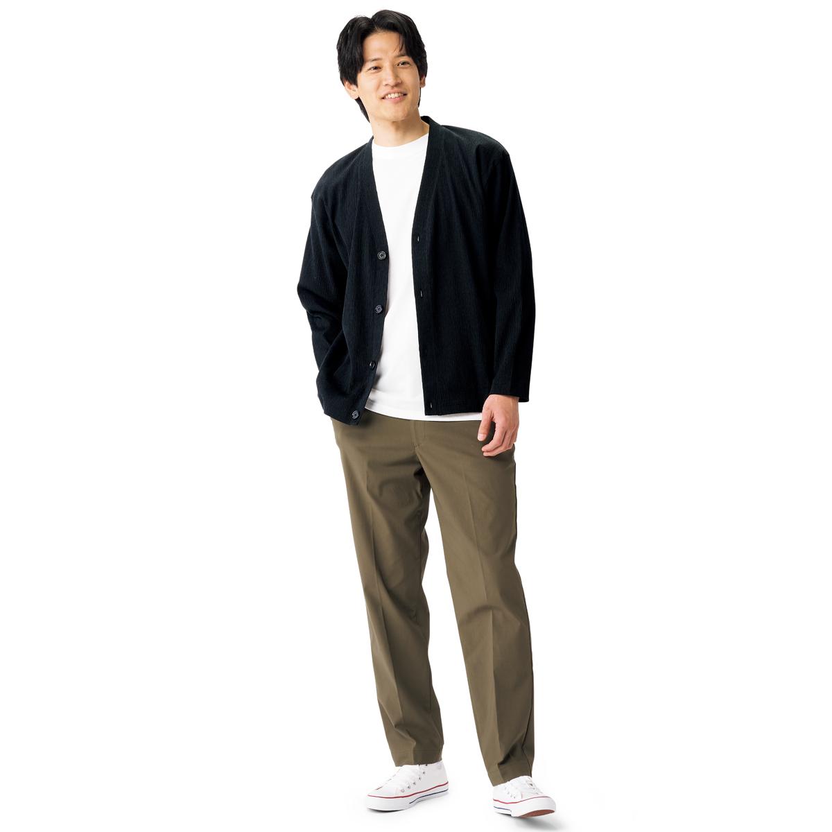 カーディガンにTシャツがセットされているので、コーデに悩む必要ナシ。カーデはVネックなので、首回りがスッキリとした印象に。