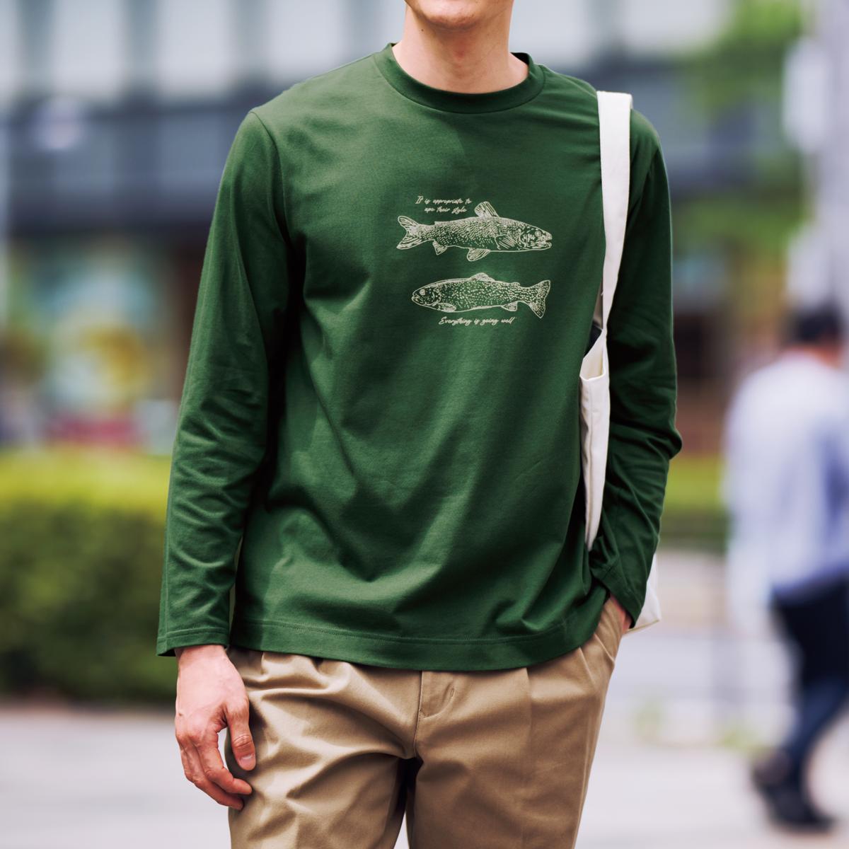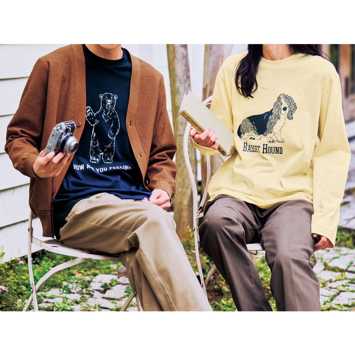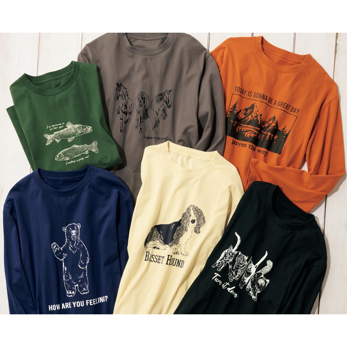 -お買い得ポイント-朝晩の肌寒さにちょうどいい。1枚でも重ね着でもサマになる頼れるTシャツ。-デザイン-味のあるイラストがセンスを語るコーデが楽しくなるプリント柄。-素材特徴-柔らかい綿100%天竺素材、プラス抗菌防臭加工で匂いを防ぐ。