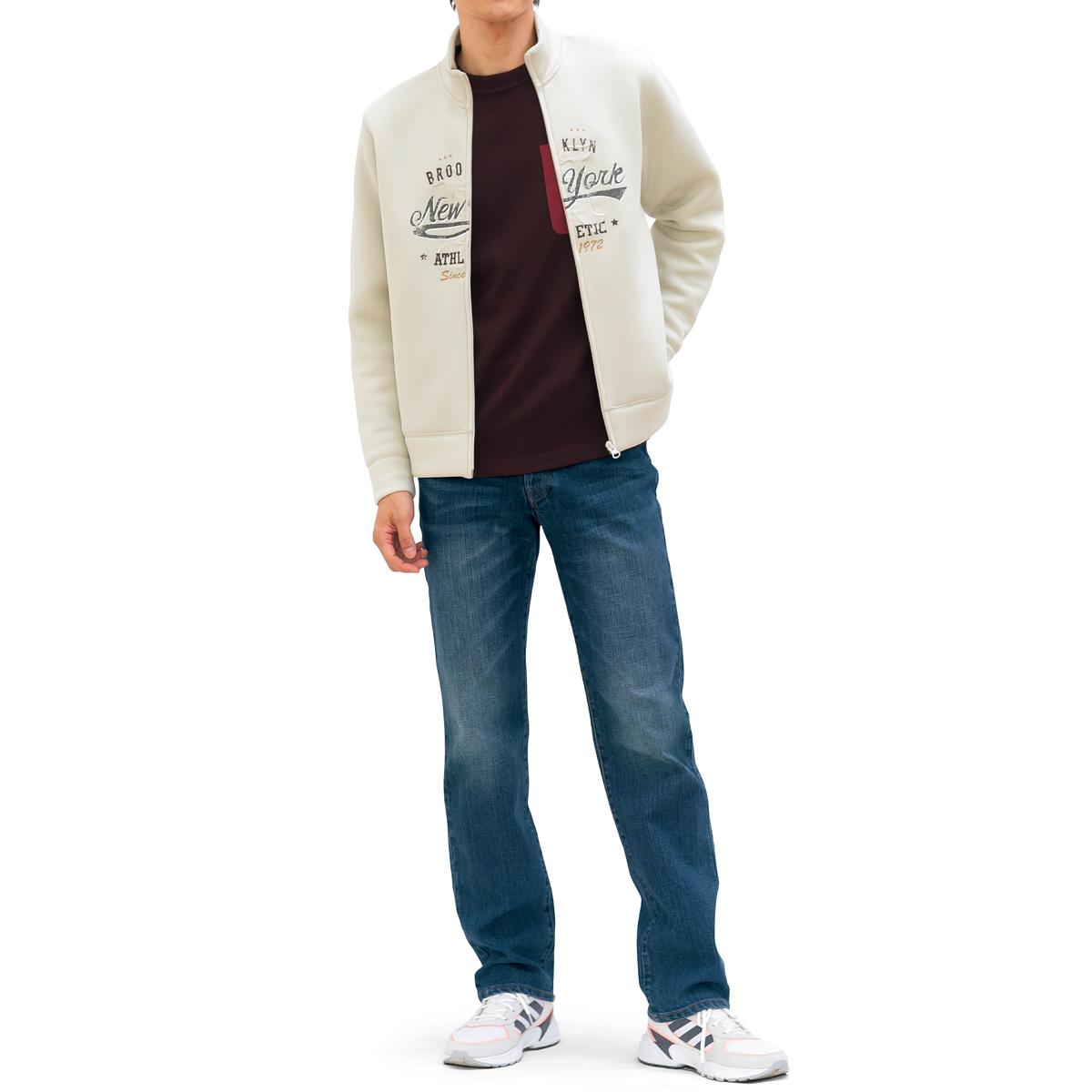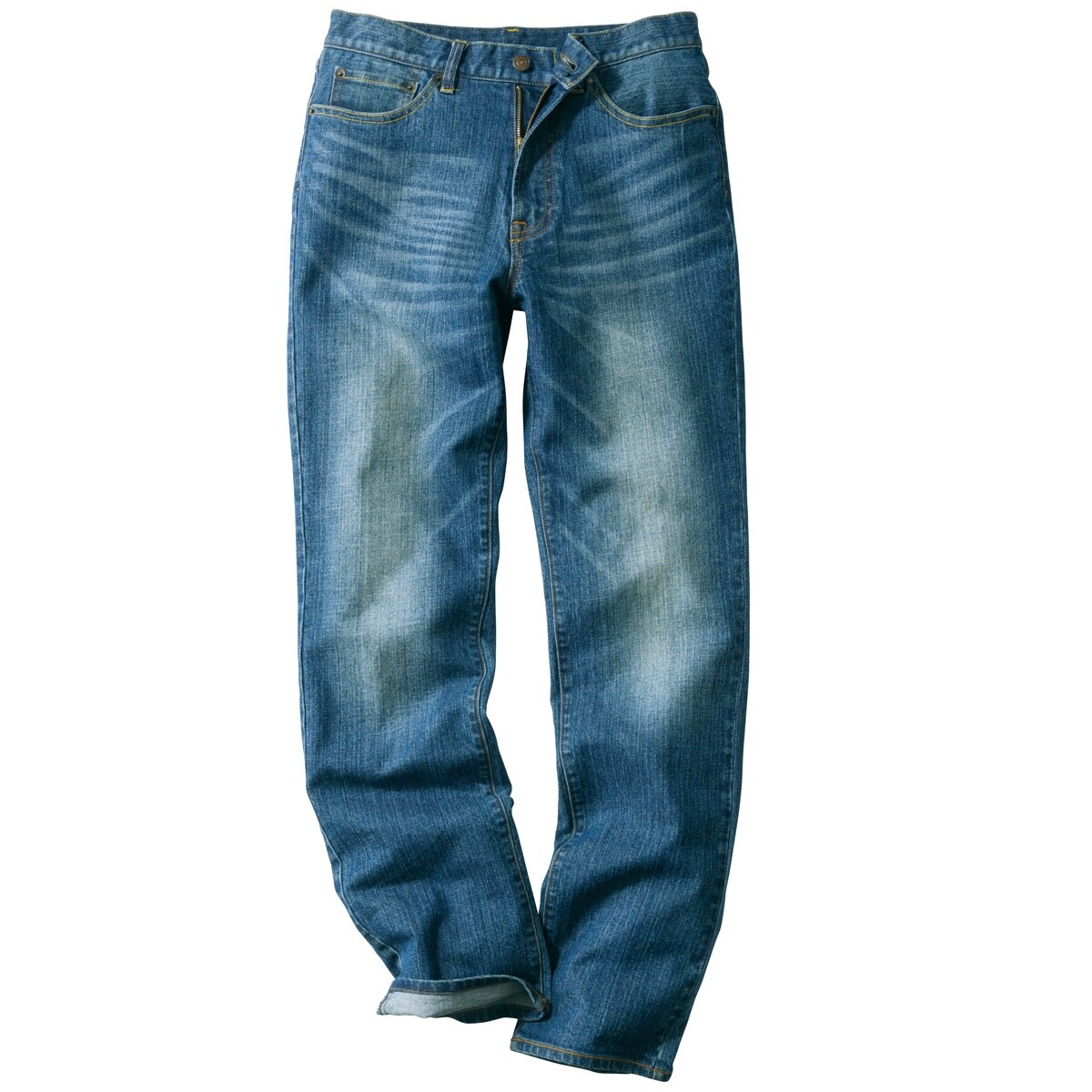 ウォッシュブルー楽ちんユーズド加工デニムヴィンテージの雰囲気をストレッチデニムで楽しむ着用例