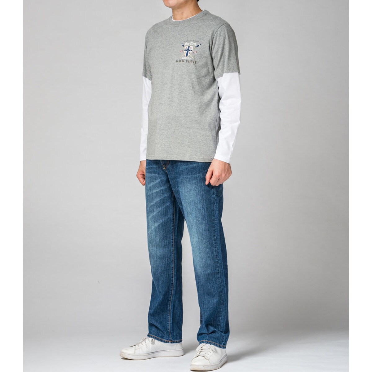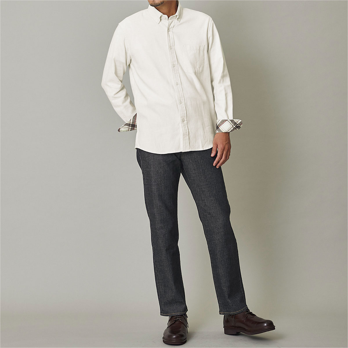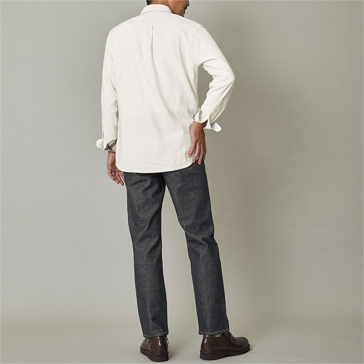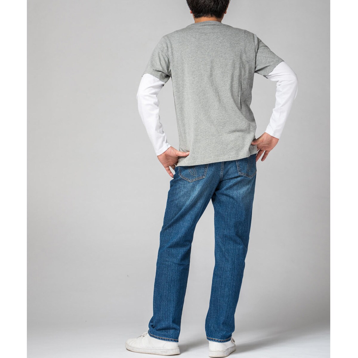 レギュラーフィット・ストレートシルエット、股上レギュラー設定の、程よくゆとりのある作り。オーソドックスで安心感のあるシルエットです。