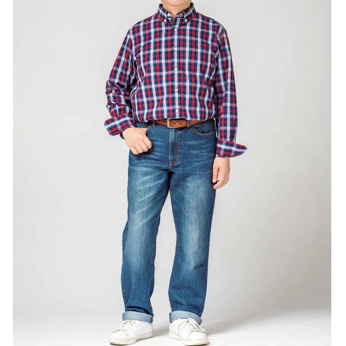 【ウォッシュブルーのみ】ヴィンテージ感のあるヒゲ&ブラスト加工の自然な風合いが魅力。実際にはき込んだデニムのような、リアルなユーズド感を楽しめます。色の落ち感を抑え、落ち着きのある仕上がりにしているので、きちんとした大人のカジュアルコーデにも馴染みやすいデザインです。■綿78%ポリエステル21%ポリウレタン1%(11.5ozデニム)●ウエスト前開き仕様●前後左右ポケット▼洗い加工をしておりますので多少の色ムラやシワがあります▼着用時の摩擦等により色移りすることがあります。また、移染しやすいので他のものと分けて洗濯してください【股下寸法を必ずご確認ください】●洗濯機OK●中国製*こちらの素材は、オールシーズン着用いただける、しっかりとした厚みとなっています。【股下5丈展開】(69cm・72cm・75cm・78cm・81cm)【ヨコストレッチ】 【大きいサイズも展開】(ウエスト~120cm) 【レギュラーフィットのストレートシルエットで股上レギュラー&カジュアル】※インディゴ染料、ブラックDは顔料染料を使用しているため、袋から出した直後は染料の臭いが残る場合がございますが、時間とともに軽減されます。※臭いの感じ方には個人差がございますが、染料の特性上ご了承ください。