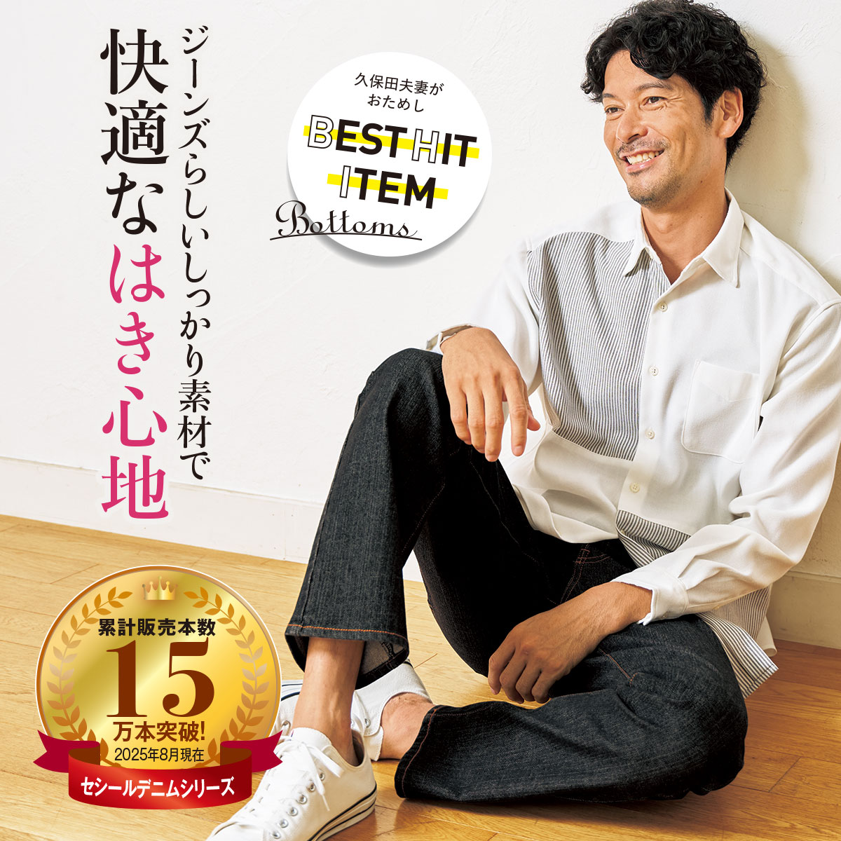 レギュラーフィット・ストレートシルエット、股上レギュラー設定の、程よくゆとりのある作り。オーソドックスで安心感のあるシルエットです。