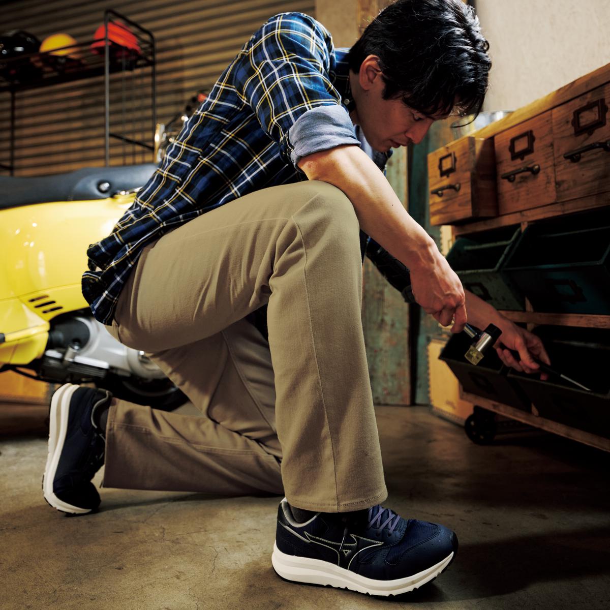 厚みがあって程よく凹凸のあるガッシリとした質感が特徴です。そんなカツラギ素材を横ストレッチ&やわらか風合いに仕上げて、絶妙な履き心地を実現しました。