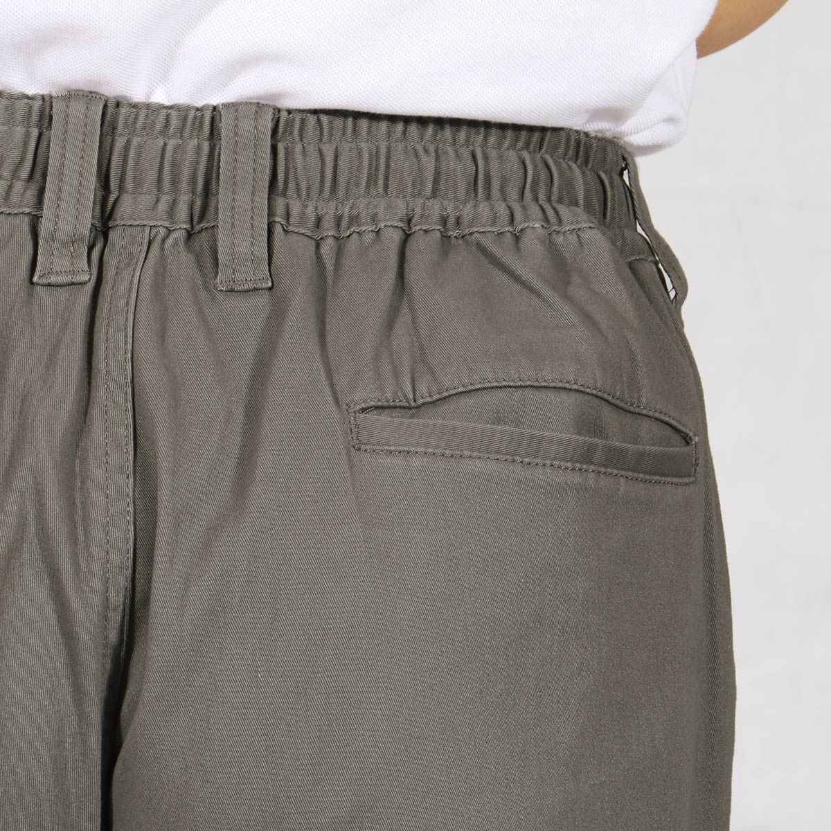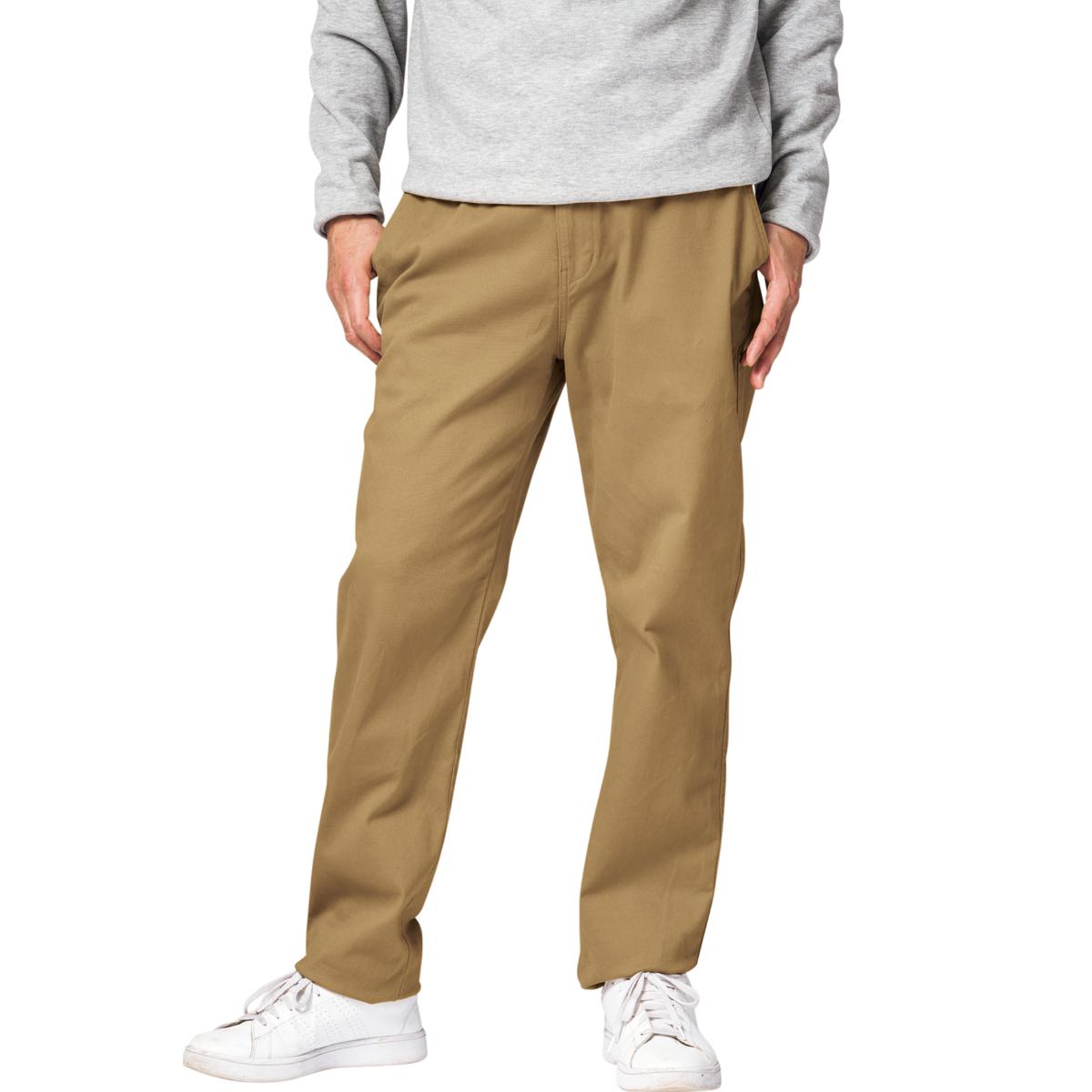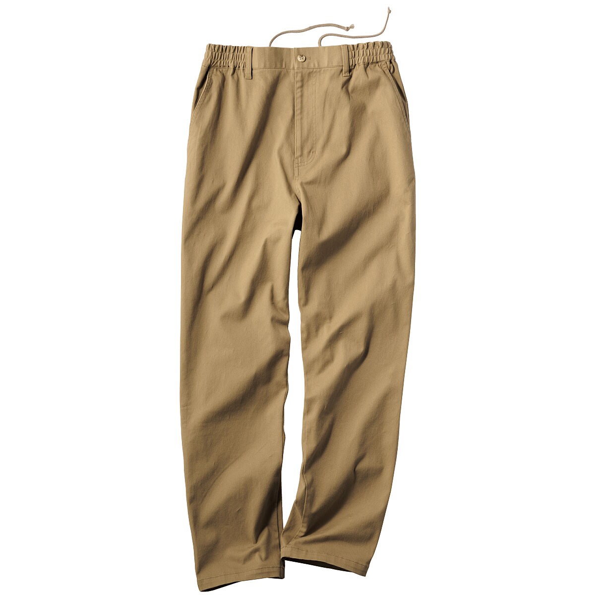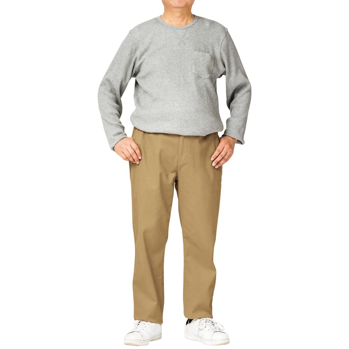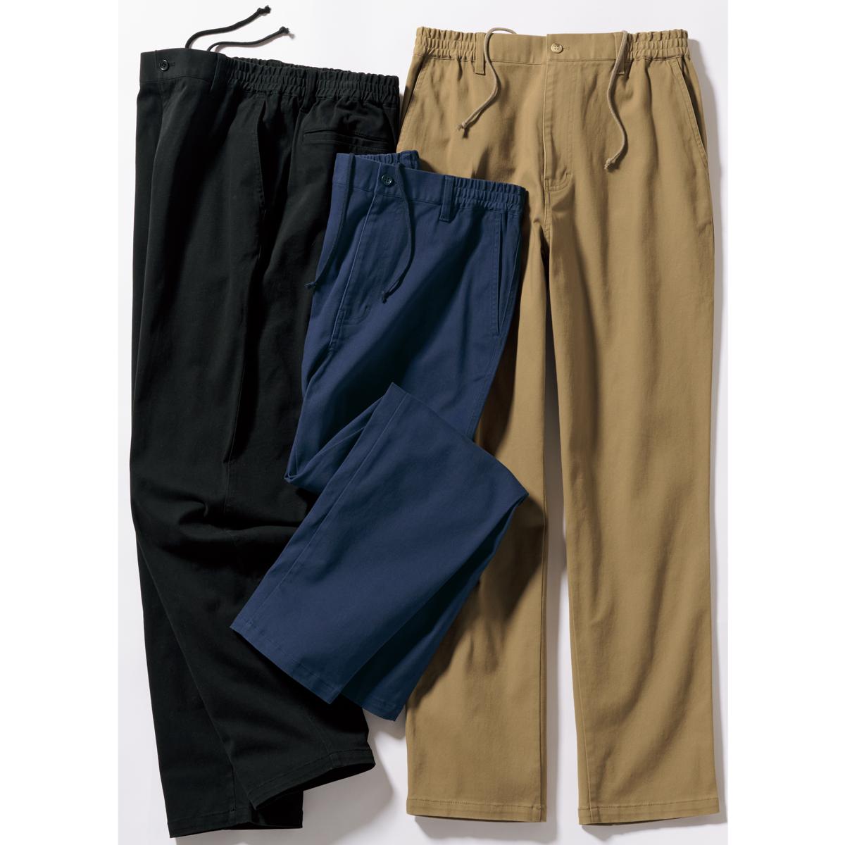 -お買い得ポイント-ストレッチが効いてはきやすいイージーウエストパンツです。-デザイン-「ヒップ周りゆったり、膝・裾はほどよくすっきり」なテーパードシルエットで、見ためしっかり、はき心地楽ちん。ウエスト内側にスピンドル(紐)を入れた仕様で微調整可能な上、前開きのデザインです。ウエストのシャーリング部分の内側にステッチを2本入れることで、ウエストのダブつきをおさえるようにしています。-素材特徴-しっかりとした厚みの20番ツイル素材で、ほどよい柔らかさの仕上げにしております。
