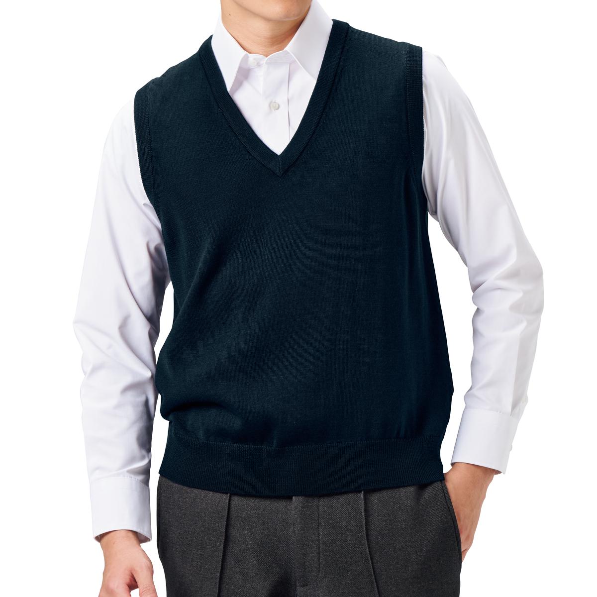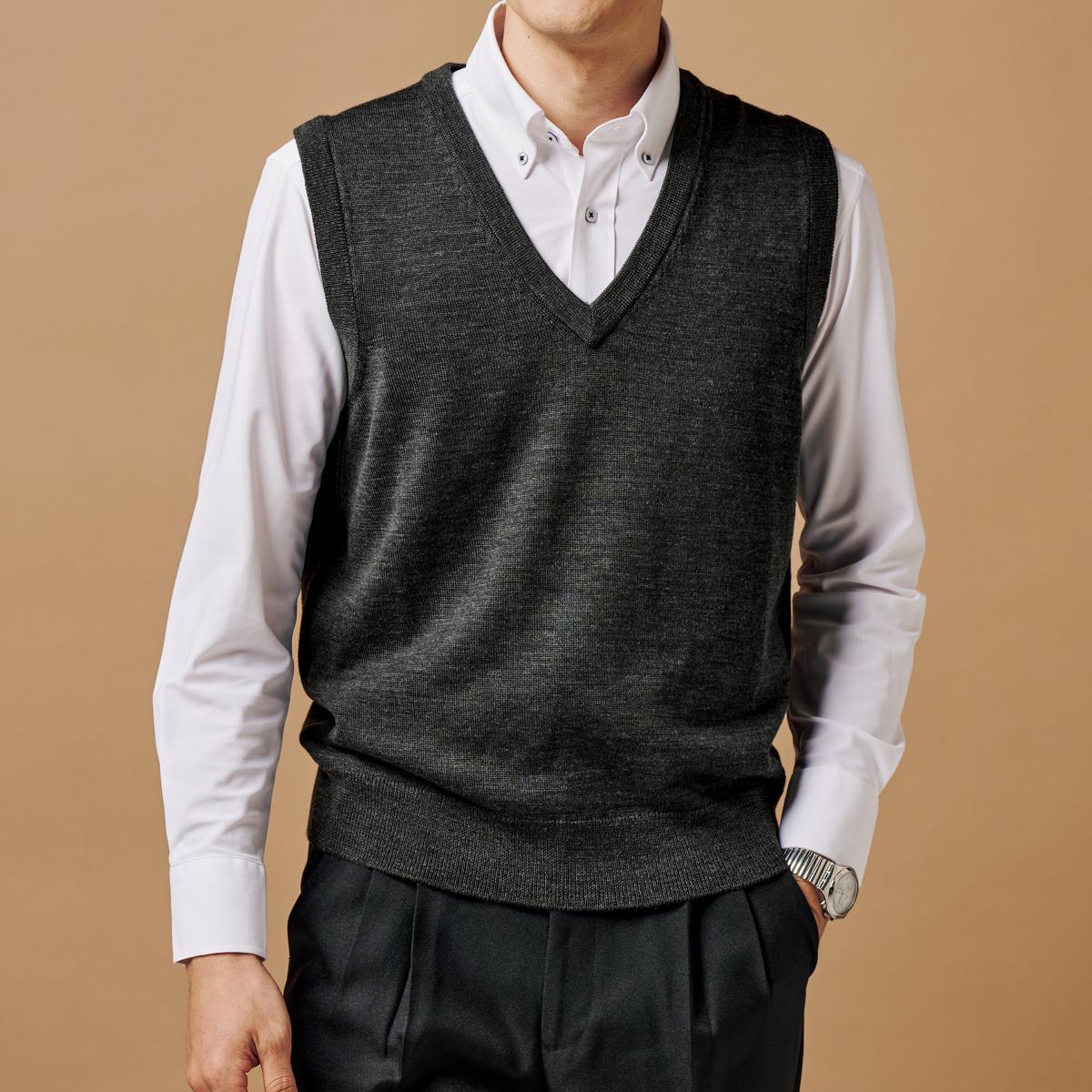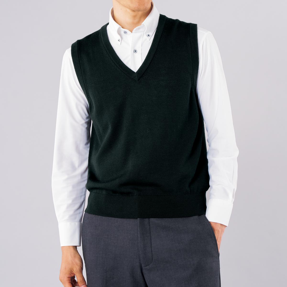 -お買い得ポイント-Yシャツと好相性なシンプルなかぶりタイプのニットベスト。肌寒く感じ始めた今に丁度いいベストタイプです。-デザイン-中のシャツを変えて休日に着ても、キレイめなコーディネートができますよ♪使いやすいベーシックなカラー展開で、合わせるモノを選びません。-素材特徴-繊維表面のウロコを取り去る特殊な加工を施すことで、繊維が絡まるのを防ぎ毛玉ができにくくなりました!ご家庭の洗濯機で洗えるので、毎日気軽に着られます。
