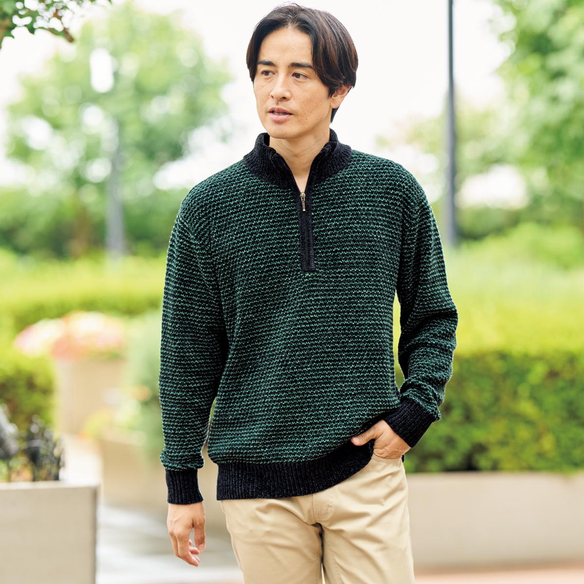 -お買い得ポイント-立体感のある編地が1枚で着てもサマになります。-デザイン-凹凸ある編み地で表情ゆたかな見た目。ハーフジップのスタンド衿で首元まであたたかいのもうれしい。-素材特徴-モールならではの起毛感と微光沢の生地の組み合わせが暖かみもあり、一枚で映える素材感です。洗濯機で丸洗いができるので、お手入れも簡単です。