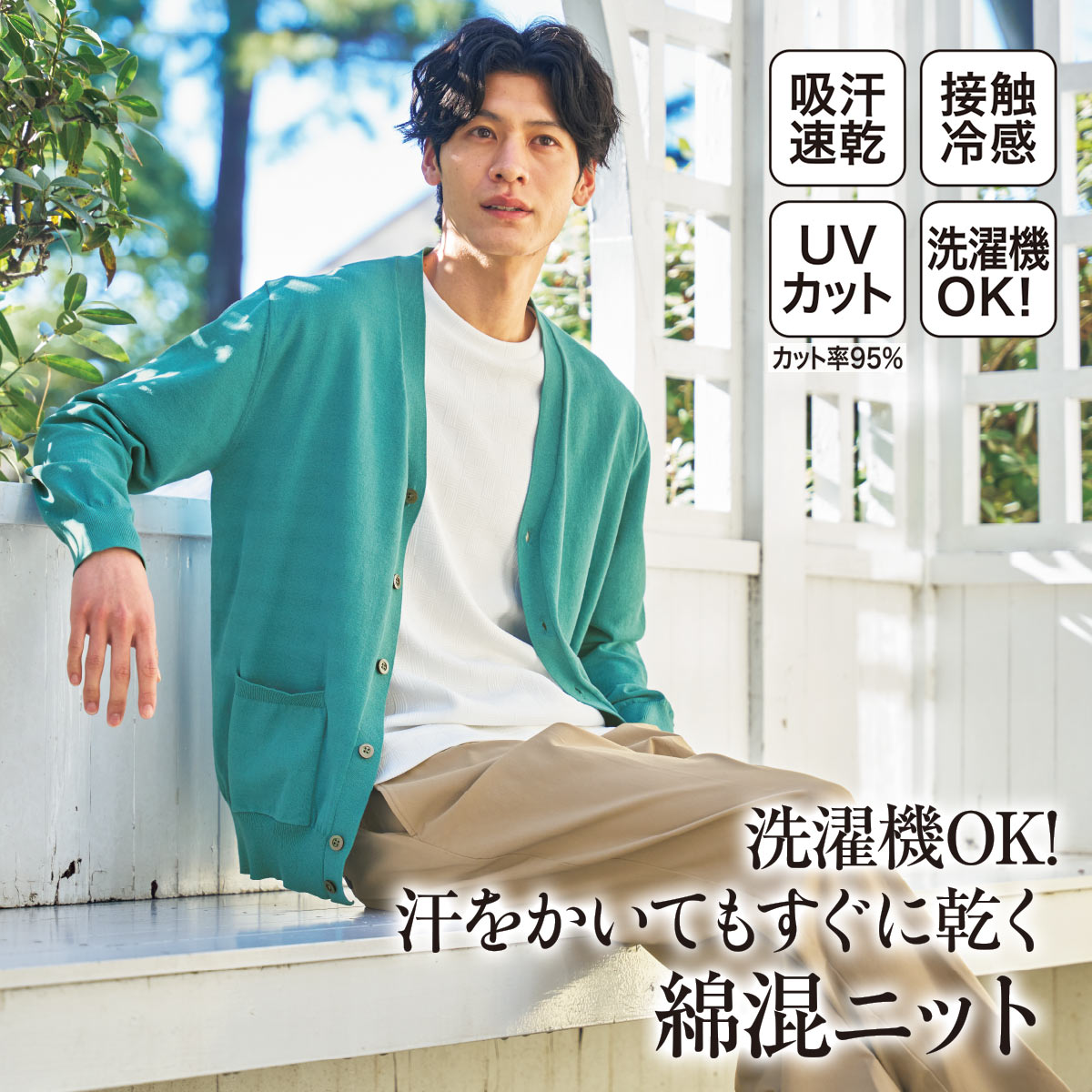 -お買い得ポイント-薄手のシンプルな綿混カーディガン。多機能だから、着るだけで快適さがアップします。おうちの洗濯機で洗えてお手入れがラク、型崩れしにくいのもうれしいポイントです。-デザイン-アームホールは立体的な編み立て。シンプルなデザインなので、着回しやすいです。-素材特徴-クールな肌ざわりの接触冷感、汗をすばやく乾かす吸汗速乾機能があり、ドライな肌ざわり。