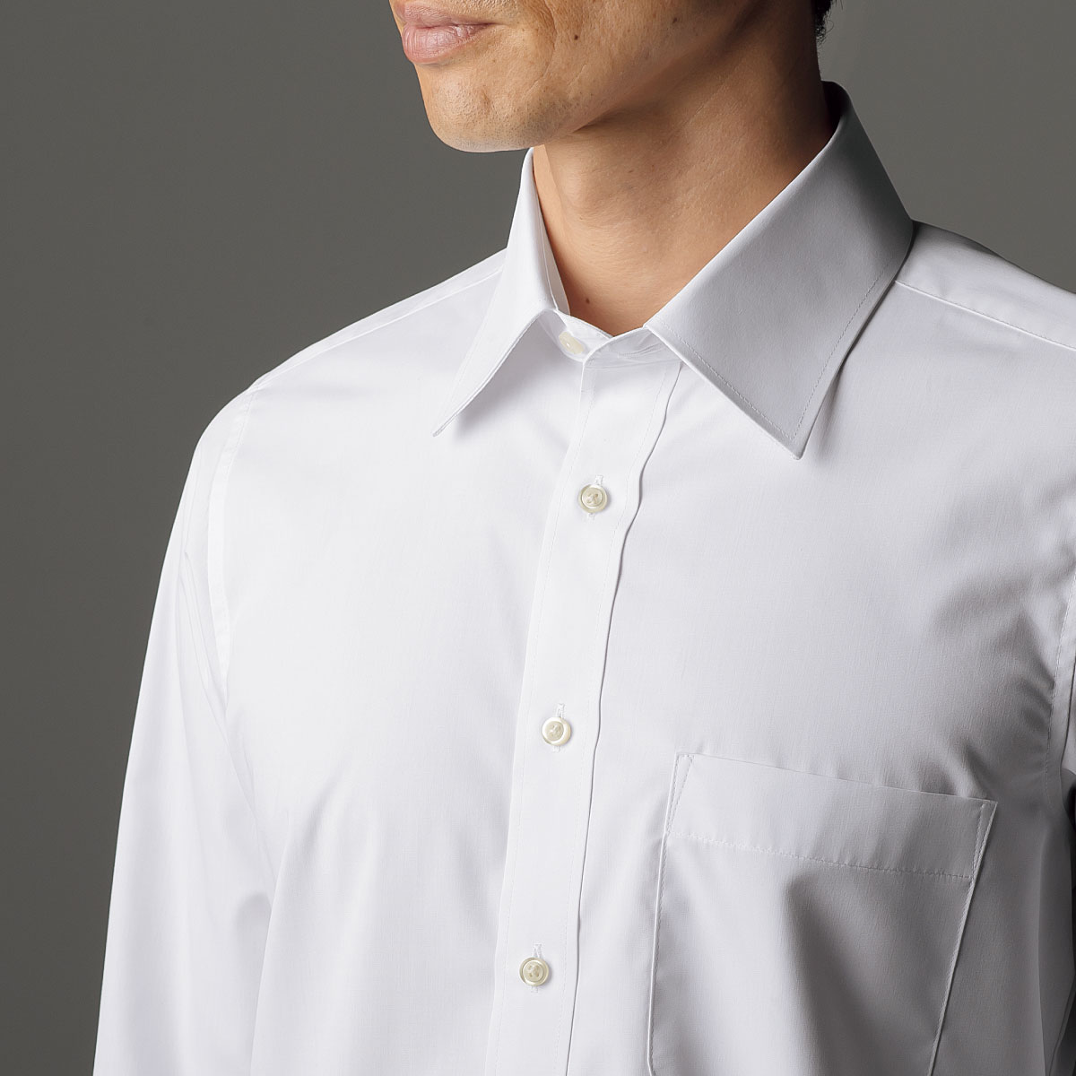 衿とカフスの芯地を張りのあるものに。ネクタイの収まりもよく胸元を端正な印象に。ホワイトA(レギュラー衿)