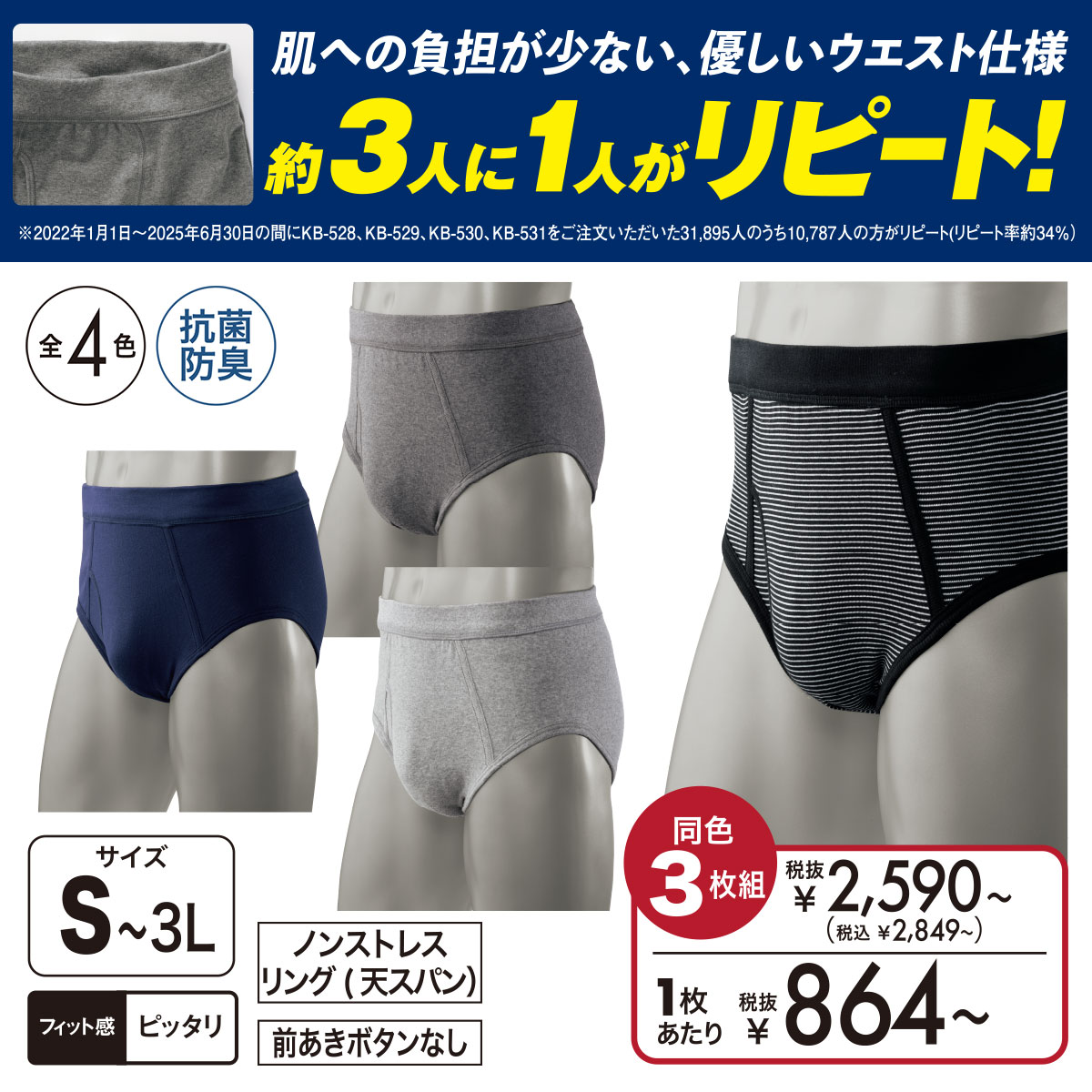 -お買い得ポイント-深いはき込み丈で安定感のあるレギュラータイプです。洗い回して毎日履ける3枚セットです。-デザイン-ウエストにゴムではなく伸縮する素材を仕様することで圧迫感を軽減。お肌への負担も少なくなりました!-素材特徴-綿100%のコットンブリーフです。(ボーダーのみ綿80%)