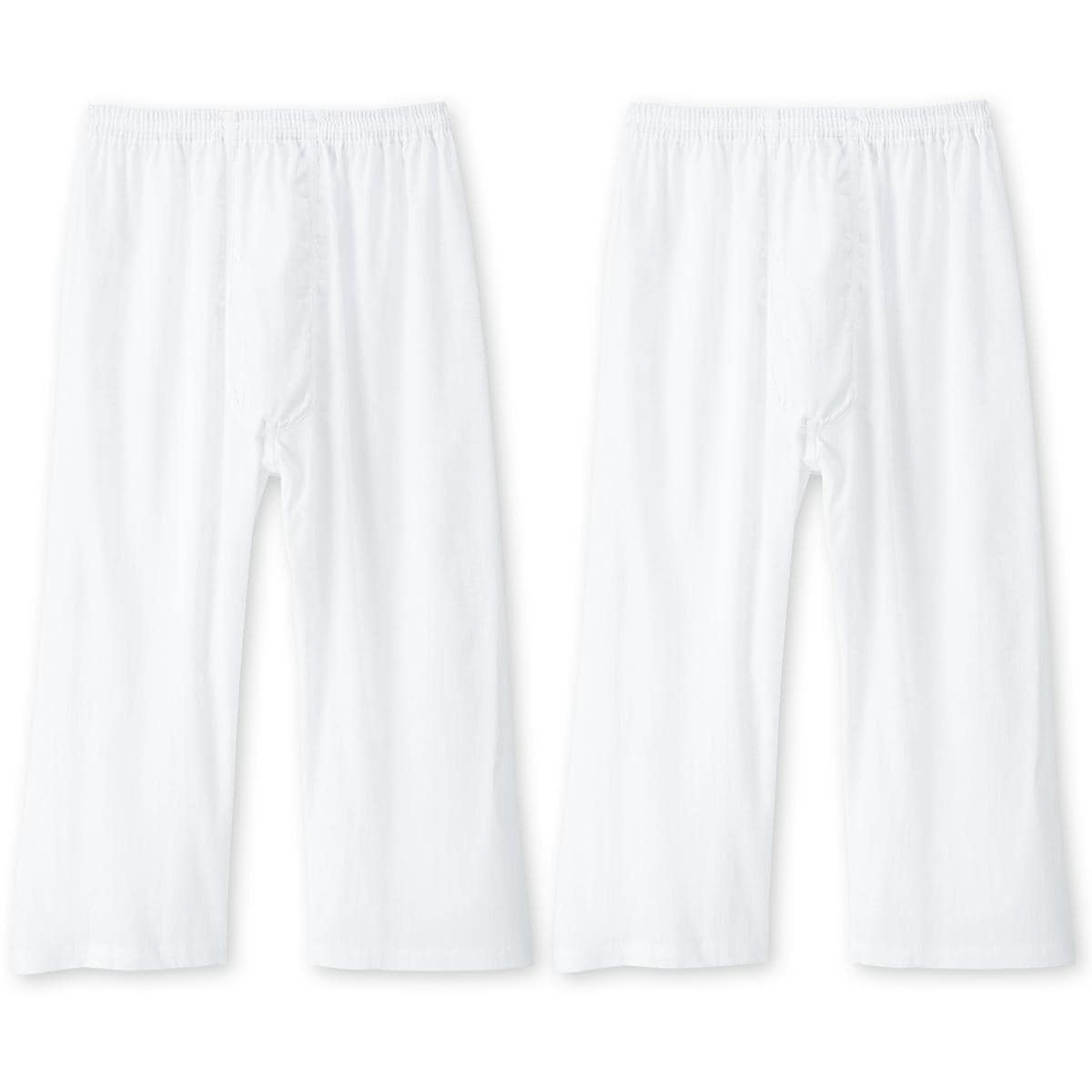 -お買い得ポイント-男の昔ながらの夏定番素材クレープ綿100%素材7分ロンパン。お得な2枚組です。-デザイン-シンプルな夏用素材を使ったロンパンです。前開き、ボタンなし仕様です。-素材特徴-生地表面の凹凸感(シボ)が特徴のクレープ素材。肌に密着しにくく通気性にも優れ、清涼感あるサラサラの肌ざわりをキープします。もも裏のべたつきを軽減します。