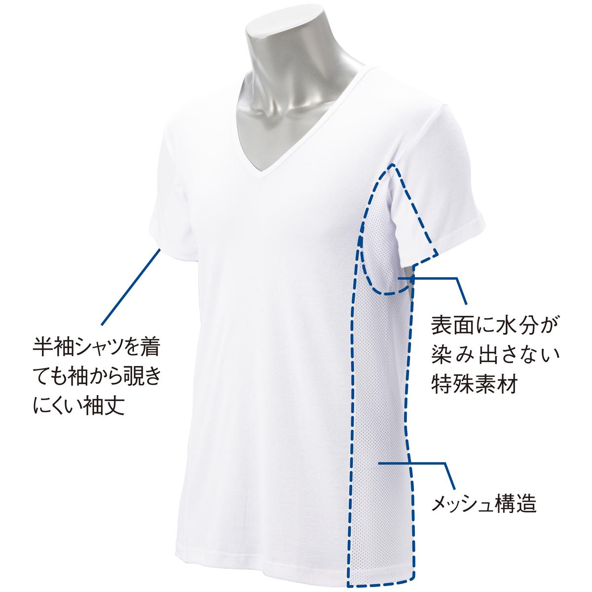 -お買い得ポイント-『汗かきで、脇に汗ジミができて困る、とはいえ厚みのあるインナーは苦手…』そんな方にお試しいただきたい、サイドメッシュ構造の、脇汗対策用インナーTシャツです。-デザイン-半袖シャツを着ても袖から覗きにくい袖丈。-素材特徴-汗が染みやすい脇部分には、帝人デュアルファイン®を使用。汗が染み出しにくく、ムレにくい、汗ジミ対応素材です。サイドはメッシュ仕様で高い通気性を確保。