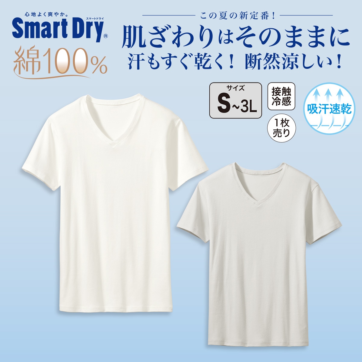-お買い得ポイント-汗ばむ季節も快適に!スマートドライで爽やかな毎日を。Vネックで首元から見えにくい為、ビジネスシャツやTシャツのインナーとしても◎。-デザイン-肌側の縫い目がフラットで、チクチク、ゴロゴロしにくい。-素材特徴-着た瞬間ひんやり。汗のベタつき感なしでさらっと軽く柔らか。