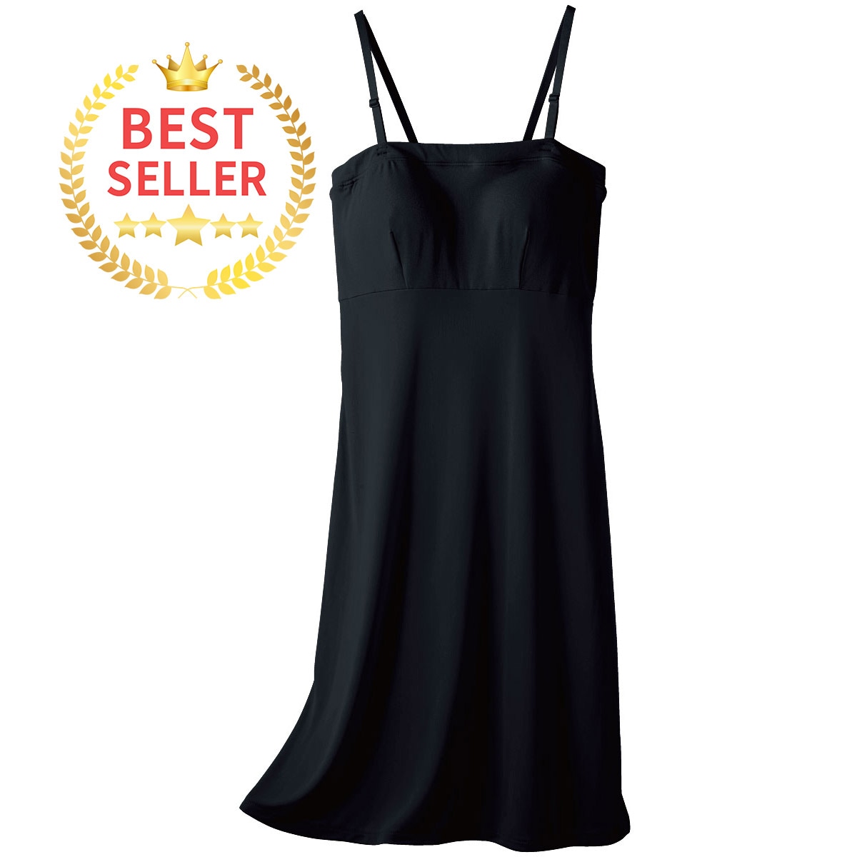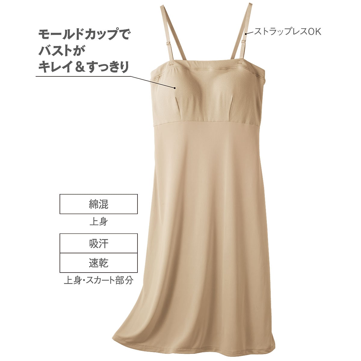 モールドカップでバストがキレイ&すっきり。上身は吸汗速乾の綿混素材、スカート部は吸汗速乾・静電気防止のなめらか上質素材を使用しています。