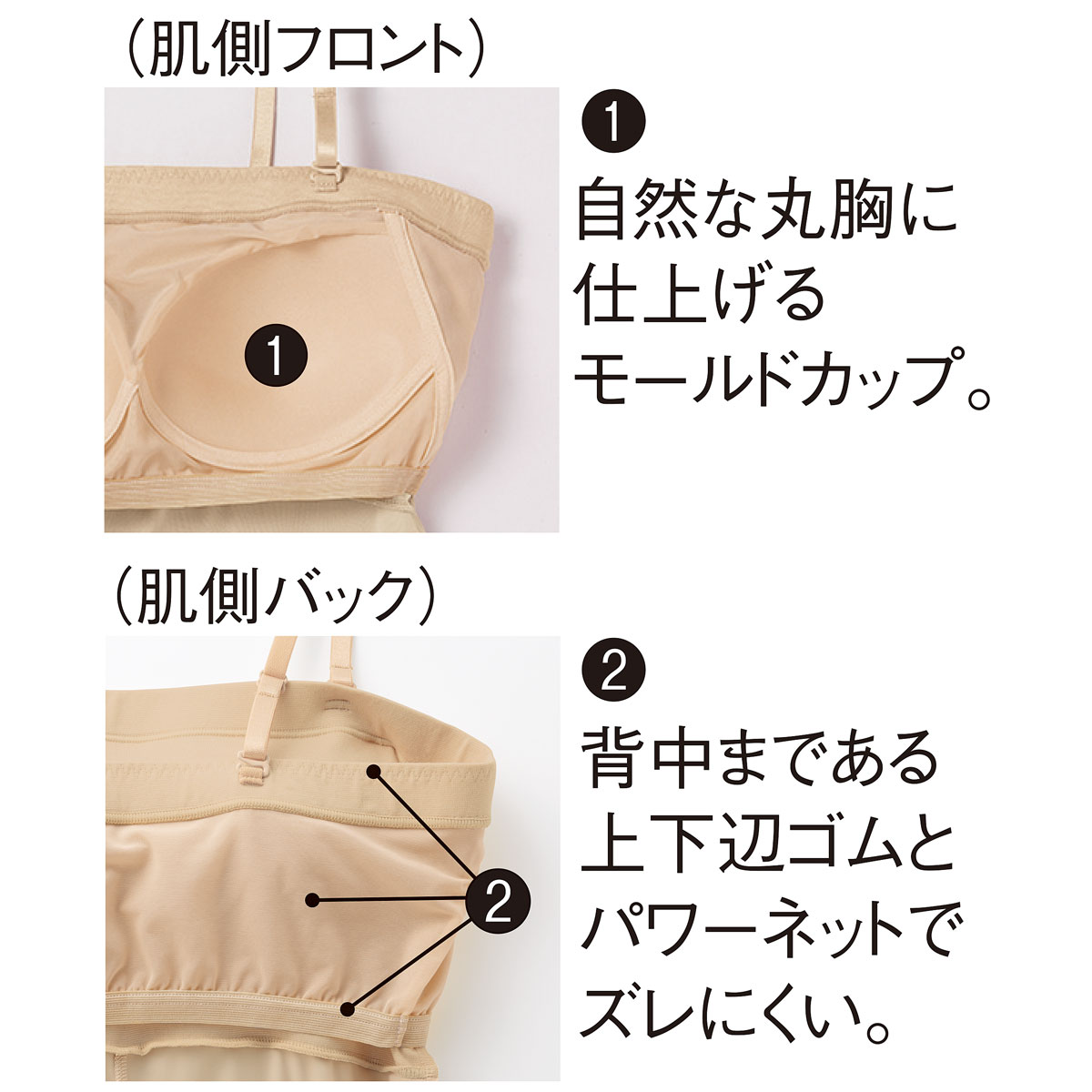 チューブトップタイプなので、背中すっきり、バストをホールド。ストラップレスでもズレにくい。