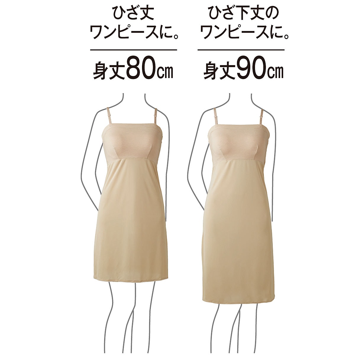 幅広いトップスの着こなしやトレンドのアウター対策に、1枚あると万能に使えるストラップレスOKのブラトップ内蔵切替えスリップ。吸汗速乾、静電気防止機能を備えた人気のおしゃれ素材使用で、汗ジミや透け、まとわりつきも防止するから、快適におしゃれが楽しめます。アウターにひびきにくいモールドカップを内蔵し、横広がりをおさえる切替パネルでサイドすっきりのキレイなシルエットに。アンダーに伸びの良い幅広テープを使うことで締め付けを軽減。選べる2丈をラインナップしました。