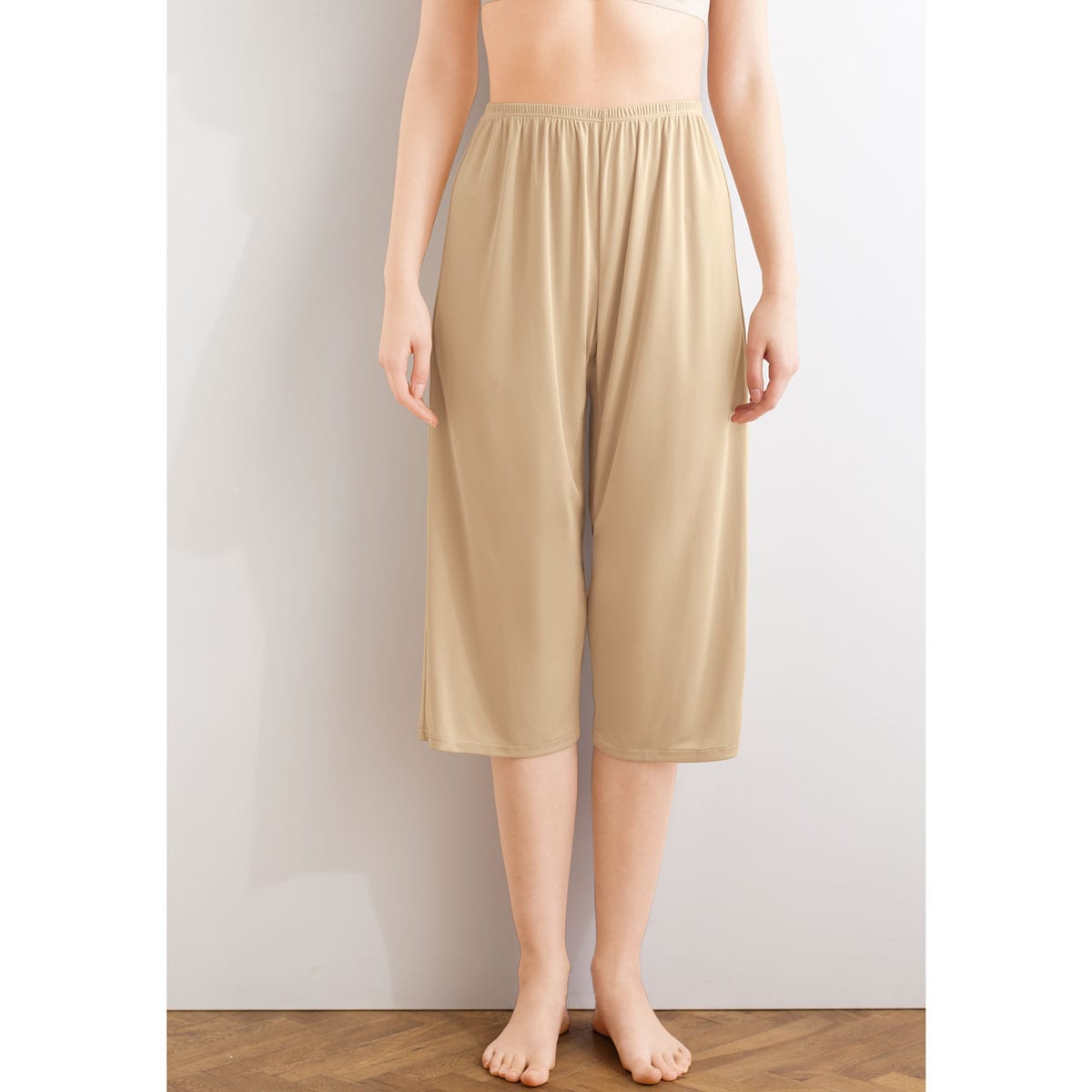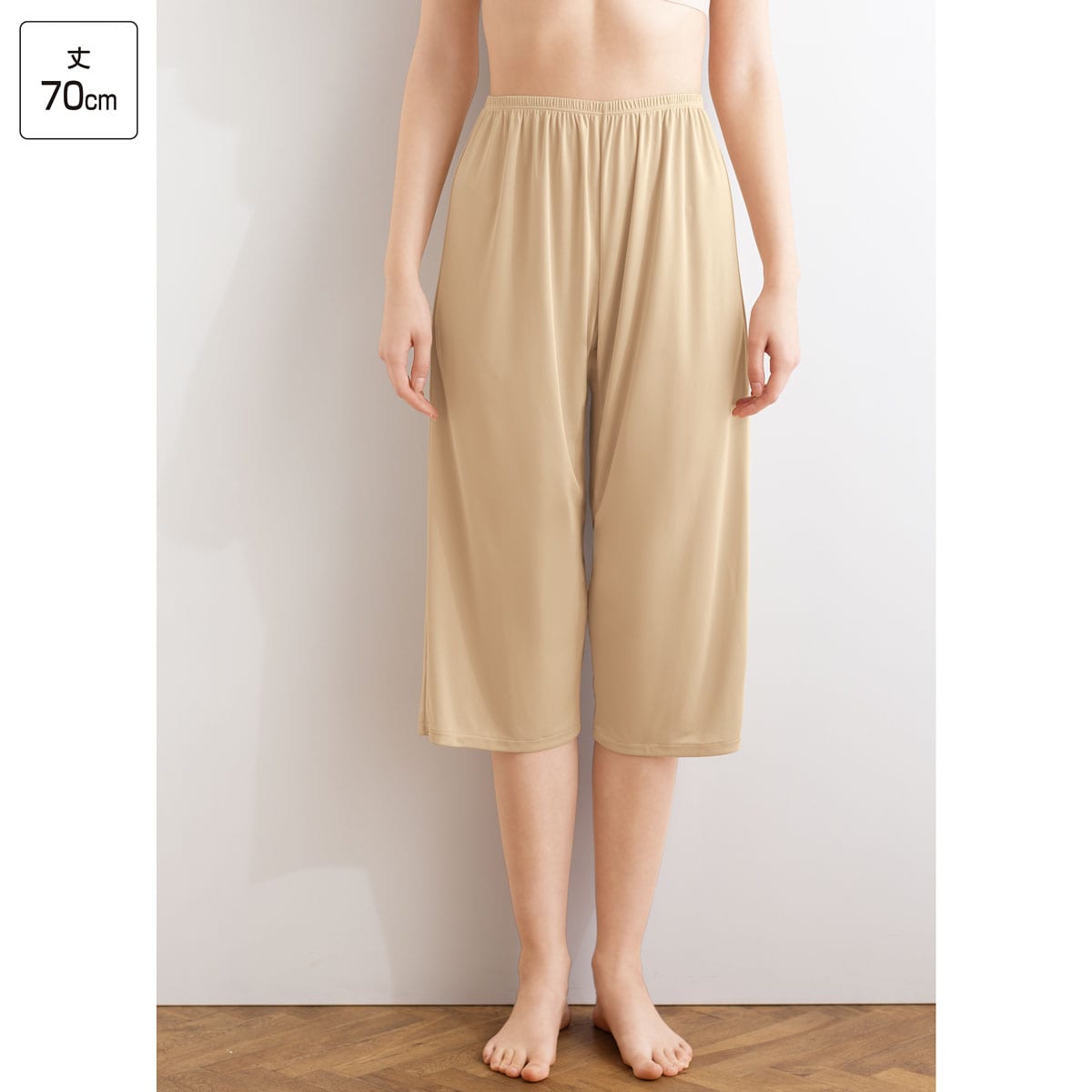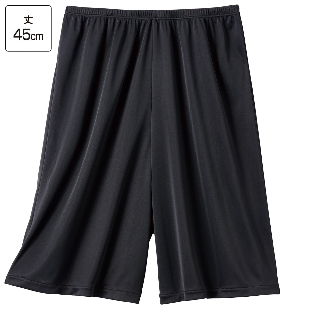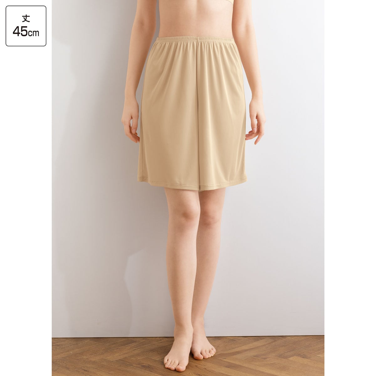 股ずれや汗・ムレをさらりとカバーする、キュロットペチコート。汗や静電気によるまとわりつきや下着の透けも防ぎます。選べる2丈丈45cm ひざ丈のパンツやスカートに※身長158cmの人の着用イメージです。身長や体型により異なります。