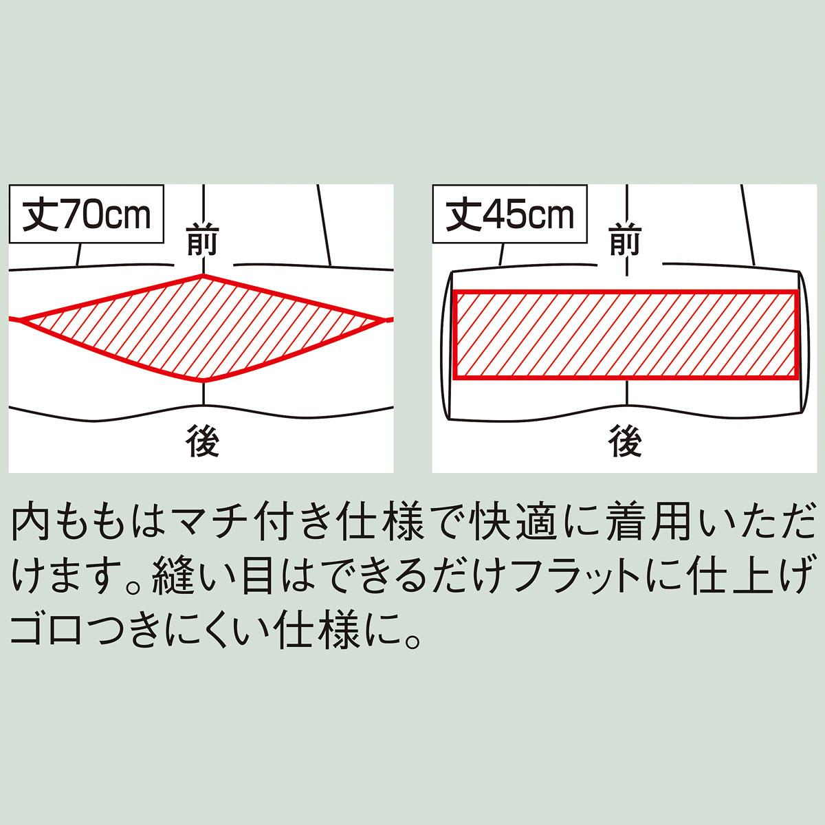 各丈とも内ももはマチ付き仕様で快適に着用いただけます。縫い目はできるだけフラットに仕上げ、ごろつきにくい仕様に。