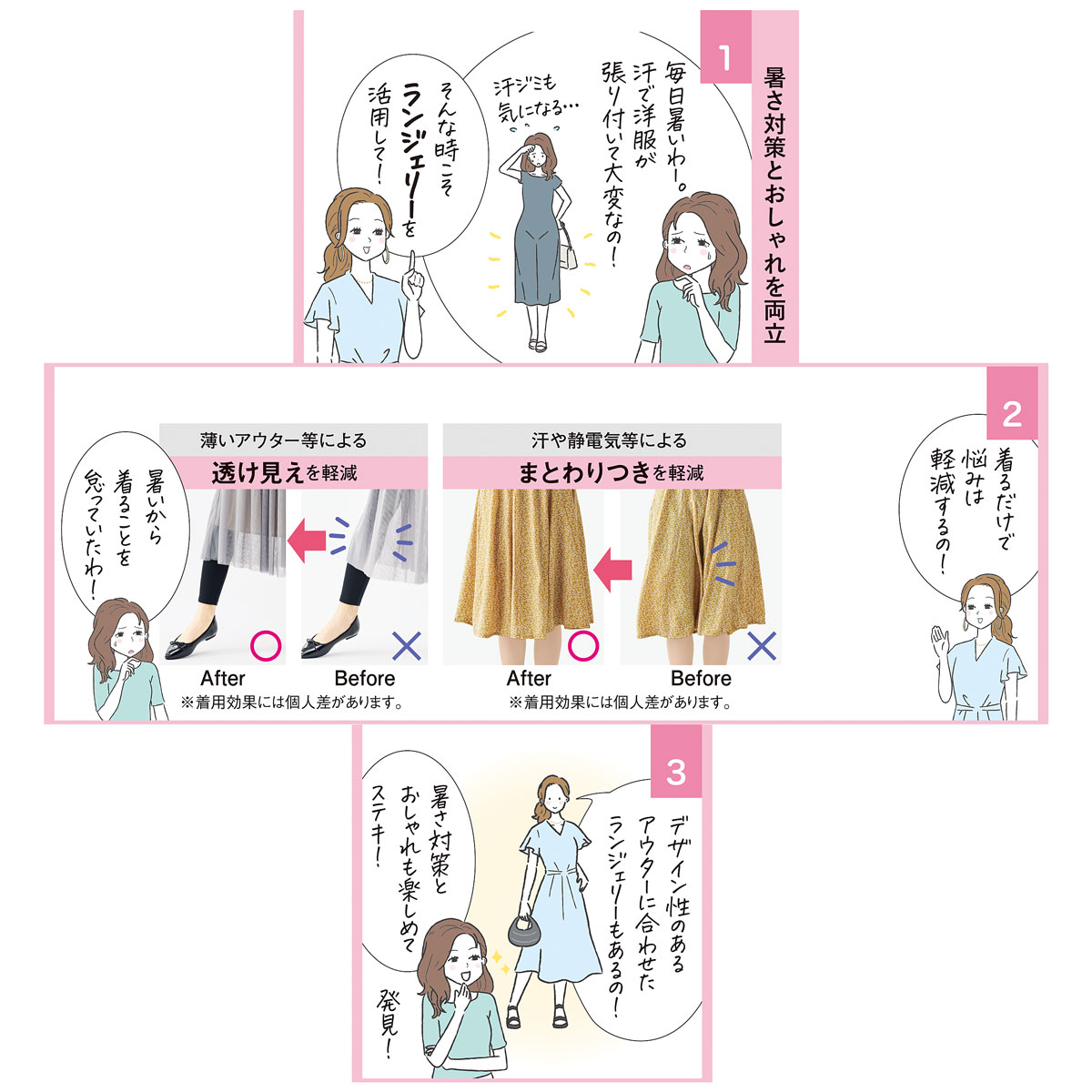 ランジェリーの着用効果・ひびきにくく、透けも防ぐ。すべりが良くまとわりつかない。汗・皮脂汚れを防止。生地が直接当たらず着心地アップ