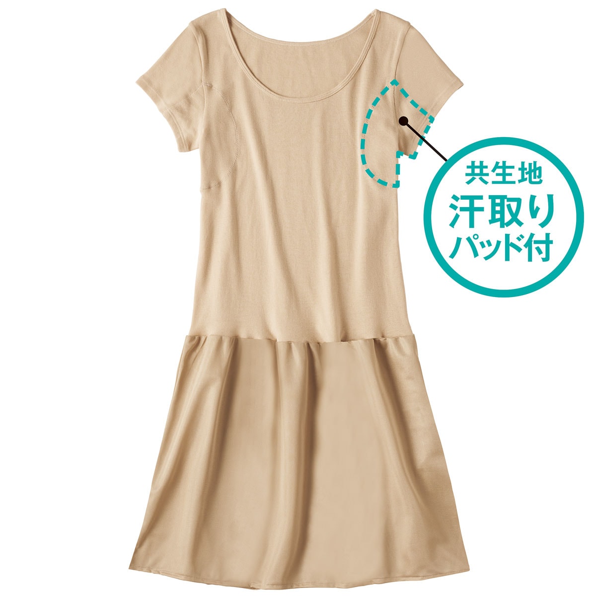 東洋紡せんい(株)の特殊紡績糸「爽快コット®」を使用し、さらっとソフトな肌心地に生まれ変わったスマートドライ®綿100%。吸汗・速乾機能を持ち、通気性に優れた綿100%素材です。サイズ毎に筒状に編み立てた生地を使っているから、脇縫いが無く縫い代のゴロつきも軽減。脇部分には共生地の汗取りパッドがついているから、汗をかいても安心。スカート部分はつるりと滑りの良いトリコット素材で、ワンピースのインに最適です。