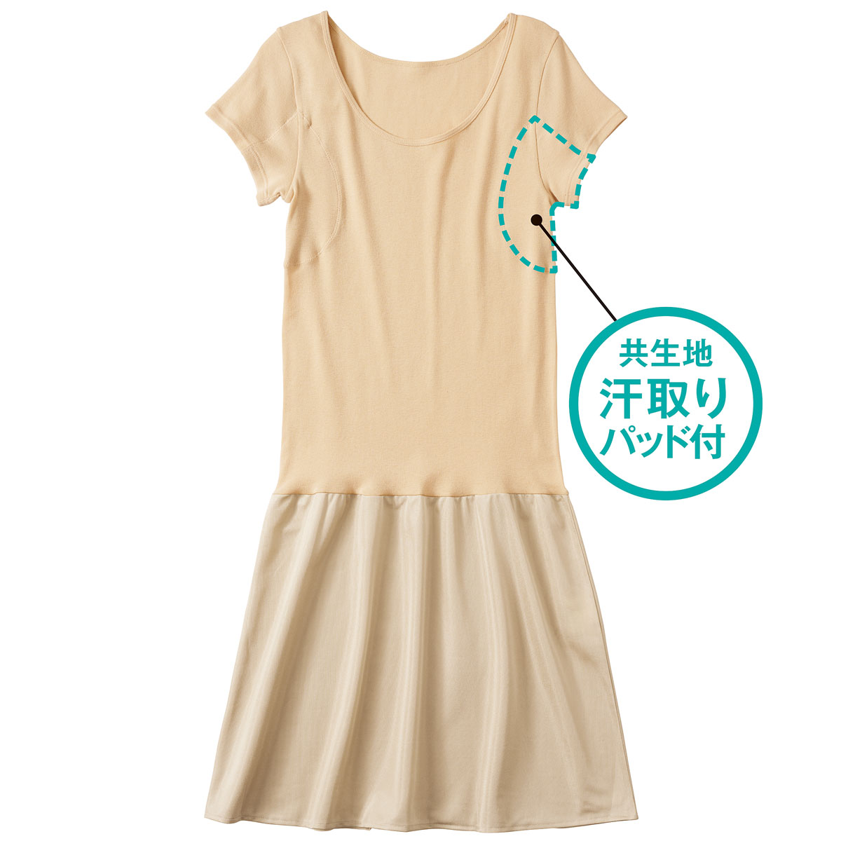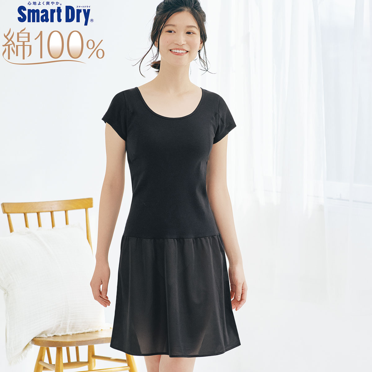 東洋紡せんい(株)の特殊紡績糸「爽快コット®」を使用し、さらっとソフトな肌心地に生まれ変わったスマートドライ®綿100%。吸汗・速乾機能を持ち、通気性に優れた綿100%素材です。サイズ毎に筒状に編み立てた生地を使っているから、脇縫いが無く縫い代のゴロつきも軽減。脇部分には共生地の汗取りパッドがついているから、汗をかいても安心。スカート部分はつるりと滑りの良いトリコット素材で、ワンピースのインに最適です。
