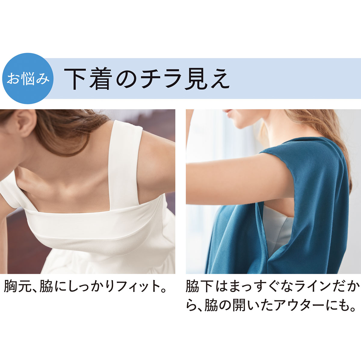 様々な下着のチラ見え対策にも!ベアトップ風の形で胸元にもしっかりフィット。太めの肩紐でブラジャーのストラップもカバーします。脇下がまっすぐなラインで、脇の開いたアウターでも安心。