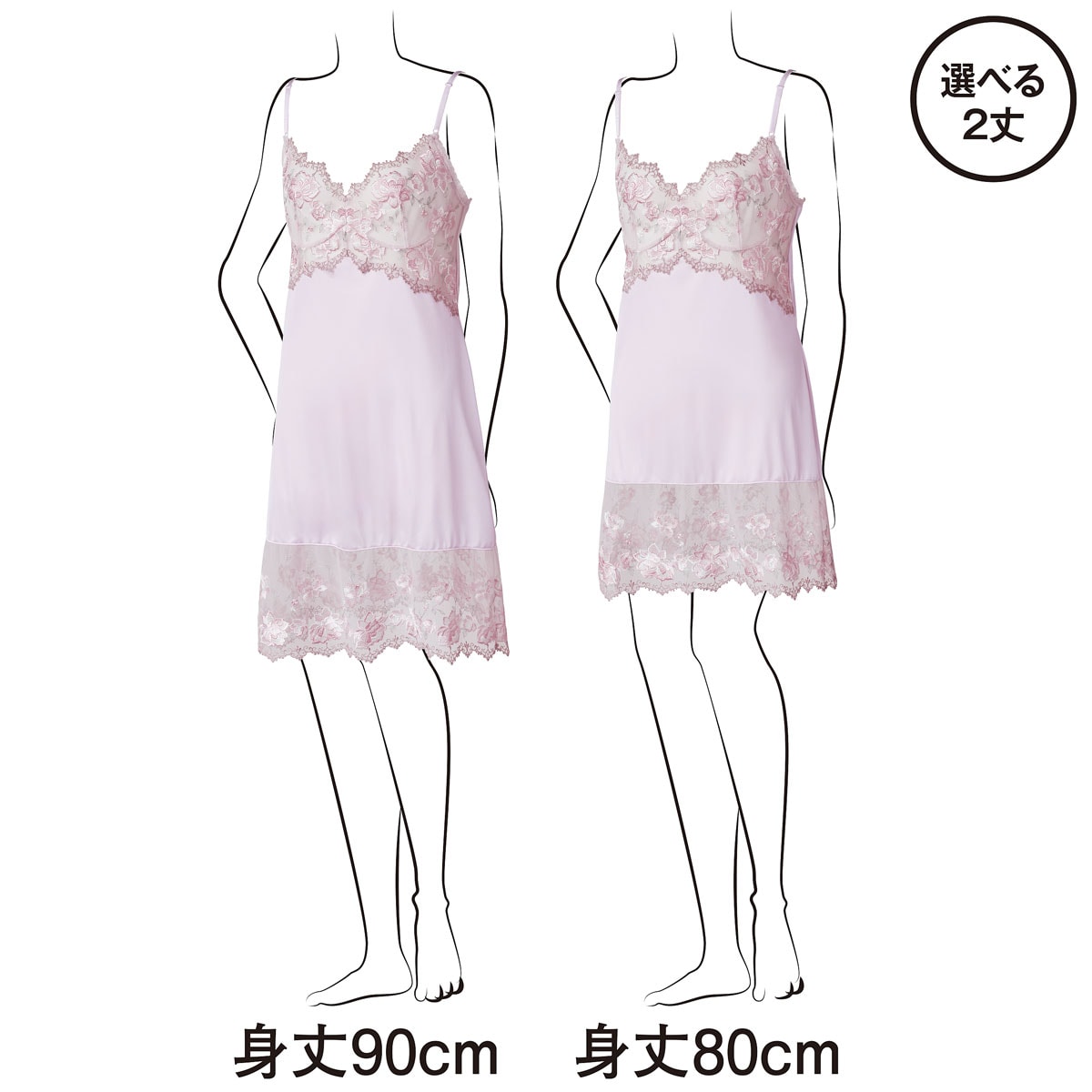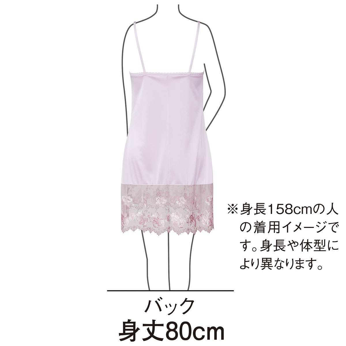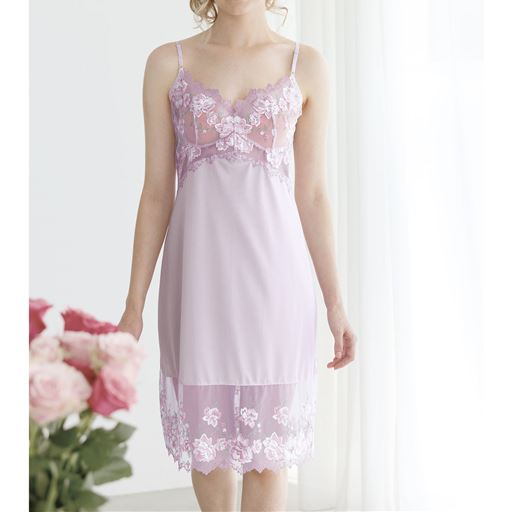 咲き誇るローズの刺しゅうレースを胸元だけでなく裾にもたっぷりと贅沢に使用した大人もときめくエレガントランジェリー。身生地は吸汗・速乾・静電気防止加工付きですべりのよいなめらかな日本製のトリコット素材だから、アウターの透けやまとわりつきを防いで快適な着心地。見た目も華やかで着るだけで気分も上がる1枚です。