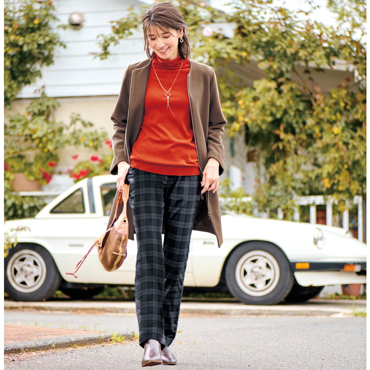• グレンチェック コーディネート例<br>モデル身長152センチ<br>着用サイズM-68<br>(トップスはNB-6759です。)
